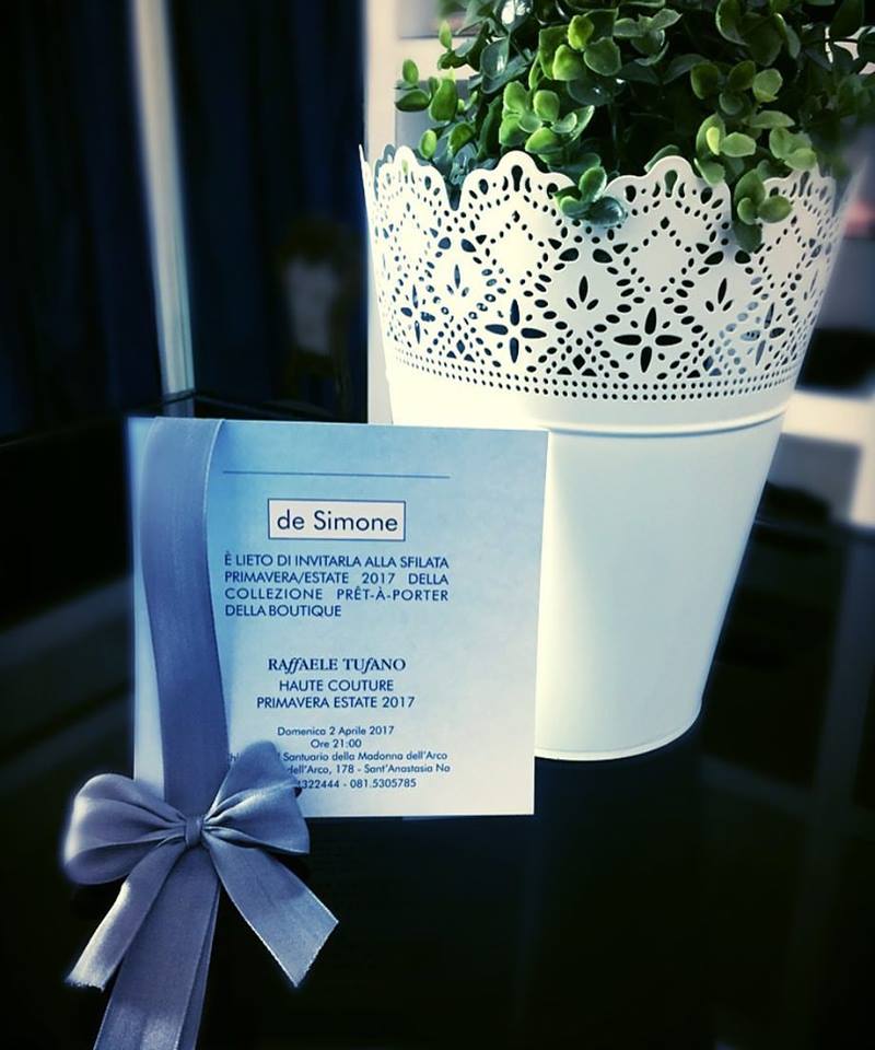 Domenica 2 aprile alle ore 21,00, al Chiostro dei Padri Domenicani del Santuario della Madonna dell’Arco a Sant’Anastasia (Na), si terrà la sfilata della boutique De Simone. Nell’incantevole scenario sarà presentata la collezione primavera/estate prět-á-porter della boutique de Simone e quella p/e Haute Couture di Raffaele Tufano, ispirata alle stampe “au pochoir” del prof. Meschini (Art Dêco).
