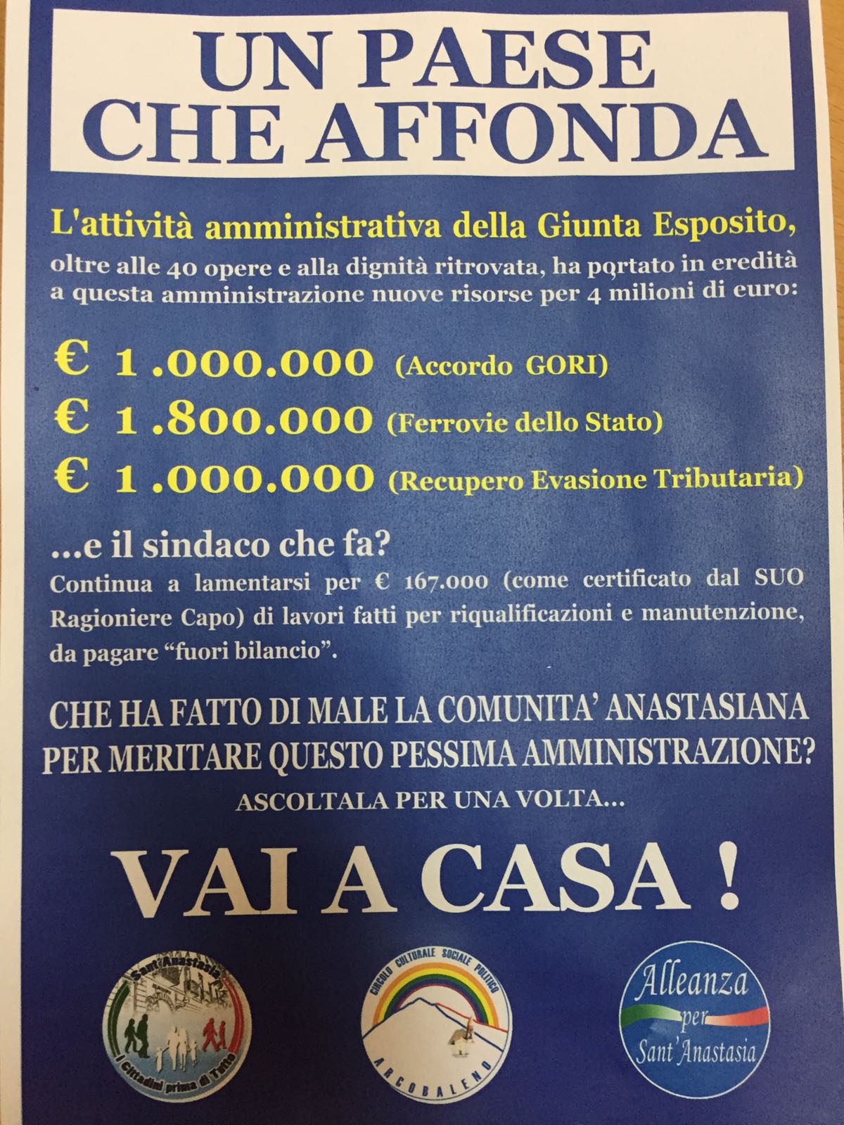 «Soltanto uno, quello relativo ad un manifesto firmato da Alleanza per Sant’Anastasia, Circolo Arcobaleno e “I cittadini prima di tutto”, risale ad oltre un mese fa se ricordo bene. Non direi che mi ha infastidito, ma certamente affermava il falso».