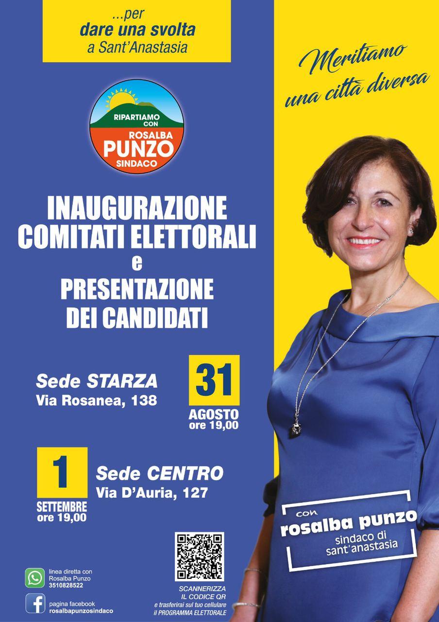 Questa sera l’appuntamento è alle 19 in via Starza Rosanea al civico 138, domani taglio del nastro per il comitato di via Antonio D’Auria 127. La candidata sindaco, unica donna tra i quattro contendenti, presenterà i 16 candidati della sua lista «Ripartiamo con Rosalba Punzo Sindaco».