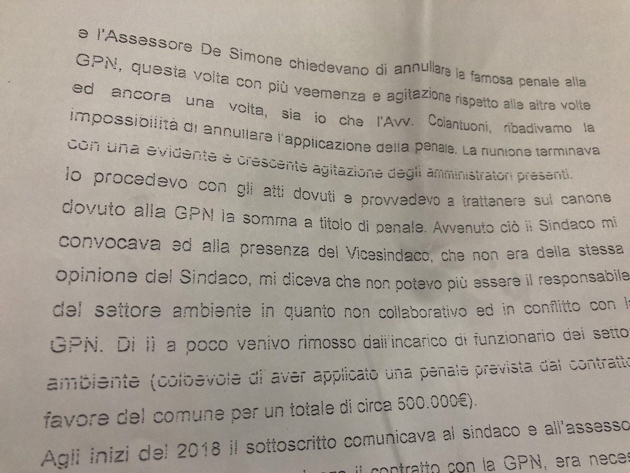 In particolare, affermerebbe nell’esposto il Pappadia (frase riportata tra virgolette nell’articolo) che il suo allontanamento sarebbe stato determinato – per espressa asserzione del Sindaco – da un «atteggiamento non collaborativo e di conflitto con la Gpn».