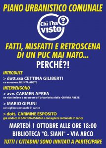 Questa sera (martedì 1 ottobre) alle 18, alla biblioteca «Giancarlo Siani» di Madonna dell’Arco, si parlerà ancora del piano urbanistico comunale. Gli organizzatori hanno scelto di mutuare il logo dal fortunato programma «Chi l’ha visto», per sottolineare il mancato varo del piano che già l’ex vicesindaco di Lello Abete, l’avvocato Carmen Aprea, aveva «denunciato» in una videointervista rilasciata al mediano.it nel corso della campagna elettorale.