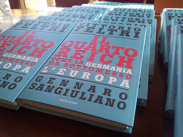 Lettere riservate a capi di governo, telefonate segrete alle più alte cariche di Stati sovrani, pressioni esercitate in mille modi da poteri forti che si muovono al di sopra e al di fuori delle elementari regole democratiche. «Come la Germania ha sottomesso l’Europa» è il sottotitolo di «Quarto Reich» edito da Mondadori scritto a quattro mani da Vittorio Feltri e da Gennaro Sangiuliano. Il libro sarà presentato, su iniziativa dell’associazione Ortocrazia, alle 19 di venerdì 3 luglio al London Park di via Libero Grassi.