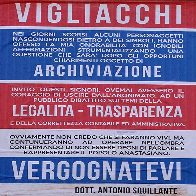 Ma tale visibilità non deve essergli bastata se ha poi deciso di firmare un manifesto ad hoc e «personale» in cui invita «Questi signori, ove mai avessero il coraggio di uscire dall’anonimato, ad un pubblico dibattito sui temi di legalità e trasparenza e della correttezza contabile e amministrativa. «Ovviamente non credo si faranno vivi – continua Squillante – ma continueranno ad operare nell’ombra, confermando di non essere degni di parlare e rappresentare il popolo anastasiano». L’assessore, che non si firma come tale sul manifesto pubblico, chiude il proclama con «Vergognatevi».