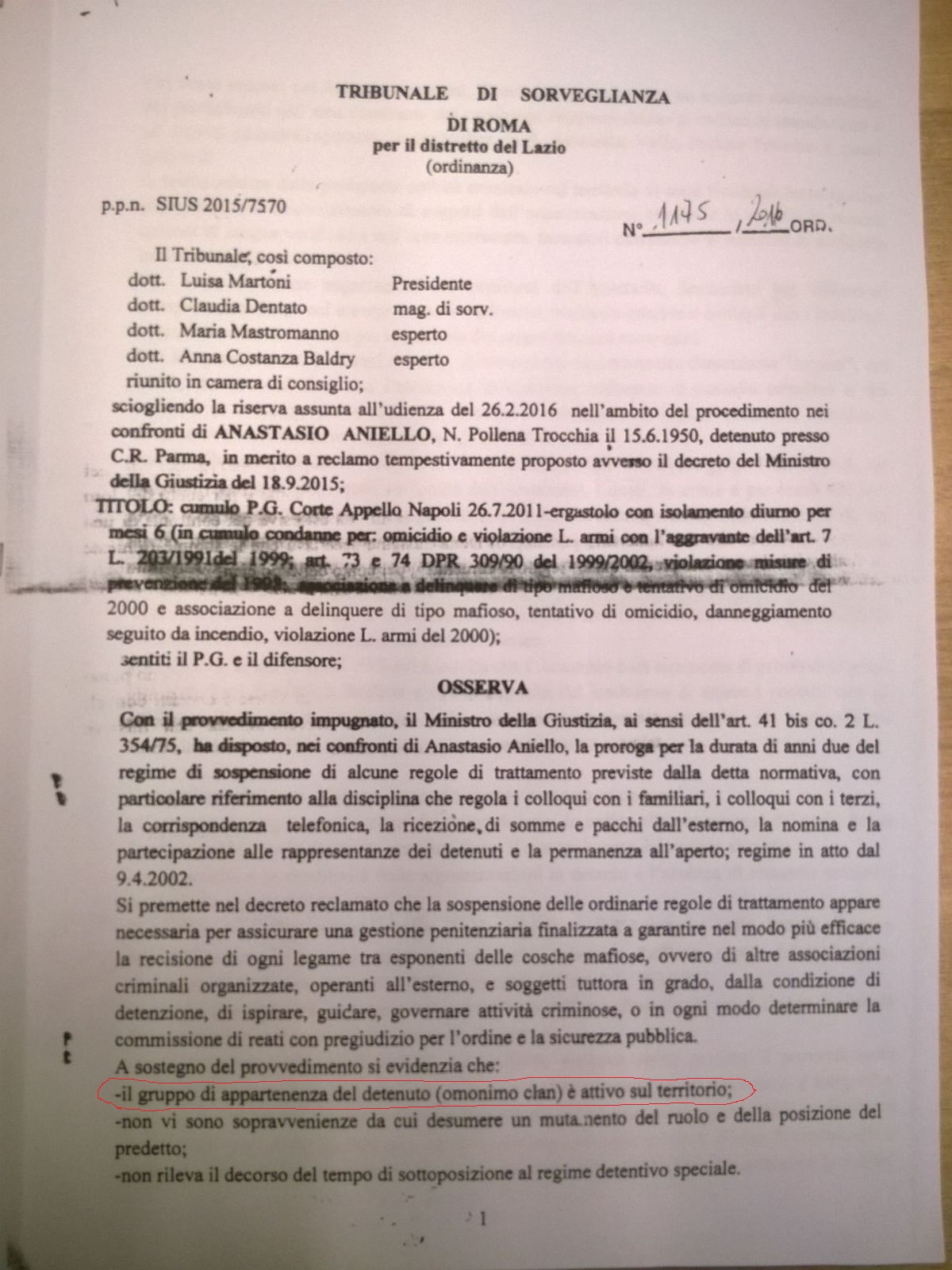 Da rimarcare quanto scritto dai giudici del Tribunale di Sorveglianza di Roma che pure hanno accolto l’istanza del difensore di Anastasio, l’avvocato Rosario Arienzo. Scrivono, infatti: «Il gruppo di appartenenza del detenuto è attivo sul territorio».