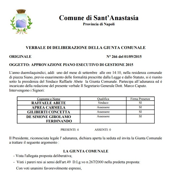 Ebbene, consultando le delibere con l’apposito link disponibile nel sito web ufficiale del Comune di Sant’Anastasia salta subito agli occhi che l’ultima in ordine di tempo è proprio il Peg. La data è quella del 1 settembre 2015. La giunta è tutta presente, come si evince dalla stessa delibera: c’è il sindaco Lello Abete, il vicesindaco Carmen Aprea, gli assessori Cettina Giliberti e Fernando De Simone. Non c’è naturalmente chi quel Peg lo ha preparato o quanto meno abbozzato (presumibilmente, giacché rientrava nelle sue competenze), l’ex assessore Armando Di Perna il quale si era, alla data riportata sulla delibera di giunta, dimesso quattro giorni prima.