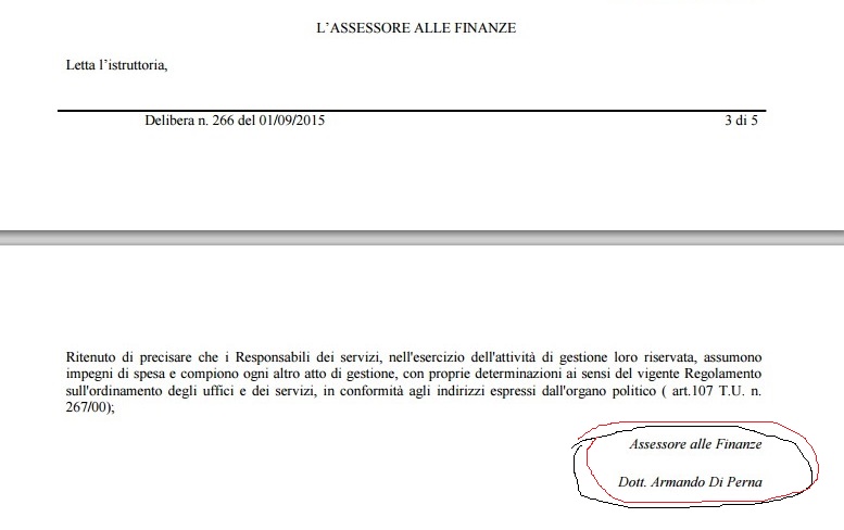 Ma andiamo avanti nel leggere l’atto: si evince che il contenuto finanziario del Peg coincide esattamente con le previsioni finanziarie del bilancio e che gli obiettivi sono coerenti con i programmi illustrati nella relazione previsionale e programmatica 2015/2017. L’istruttore è naturalmente la dott.ssa Rossella Romano, la responsabile del settore risorse finanziarie. Ma la sorpresa arriva qualche rigo più tardi quando nella delibera si ritrova inaspettatamente il nome, dunque la firma – quantomeno nell’atto caricato sul web – dell’assessore. Cioè, chiariamo, non è che il sindaco abbia già completato la giunta e che la delibera sia stata firmata dal nuovo assessore con delega al bilancio. La firma è quella di Armando Di Perna che il 1 settembre 2015 in giunta non c’era già più, tant’è che nelle presenze non viene nemmeno citato. Poco dopo c’è la formula di rito: «letto, confermato e sottoscritto» da chi di dovere, vale a dire il sindaco Abete e il segretario generale dell’Ente.