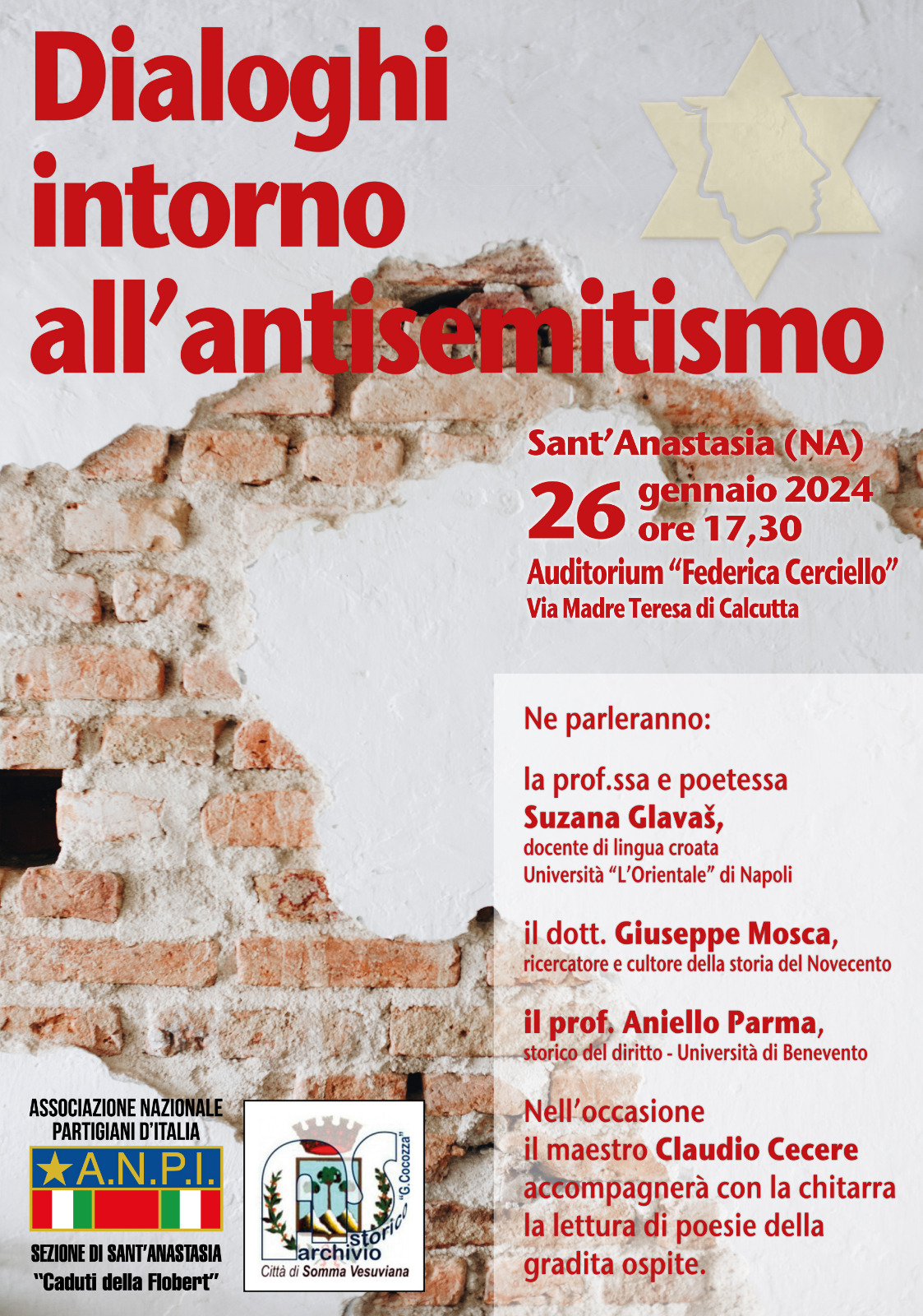 L’ANPI Caduti della Flobert di Sant’ Anastasia, in collaborazione con l’ Archivio storico cittadino di Somma Vesuviana, ha organizzato un convegno dal titolo: Dialoghi intorno all’antisemitismo.