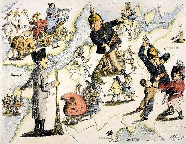 Il 1848 fu l’anno della rivoluzione liberale. In una “caricatura” dell’ “Arlecchino” due “liberali” napoletani, armati di scopa, spazzano via uomini e bagagli della vecchia politica e fanno spazio agli “uomini nuovi”, che però, come occupano le poltrone dei ministeri, diventano più vecchi di Adamo. Erano così numerose le richieste di “posti” importanti che il giornale propose di assegnare cariche e stipendi con il sorteggio. Pompei e Ercolano vennero distrutte non dal Vesuvio, ma dalle bombe di Plinio: volevano la Costituzione e l’ indipendenza da Roma.