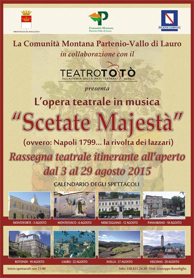 “Scetate Majestà” ovvero: Napoli 1799…la rivolta dei lazzari. Da lunedì 3 agosto a sabato 29 agosto 2015, su otto storiche piazze della Comunità Montana Partenio-Valle di Lauro, “La Compagnia dell’Accademia” del Teatro Totò porterà in scena “Scetate Majestà” ovvero “Napoli 1799… la rivolta dei Lazzari” . Regia di Enzo Liguori.