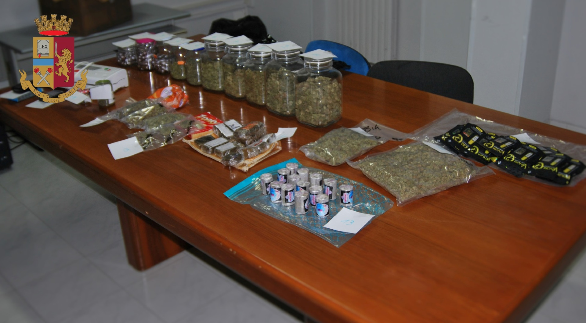 Infine, in via Potenga, i poliziotti hanno effettuato un controllo presso l’abitazione di un uomo dove hanno rinvenuto 10 barattoli e 6 bustine contenenti complessivamente circa 3 kg di marijuana ed altri 3 barattoli e 16 involucri contenenti circa 1 kg e mezzo di hashish; inoltre, hanno trovato una macchina per il sottovuoto, due bilancini di precisione, diverso materiale per il confezionamento e 5100 euro.