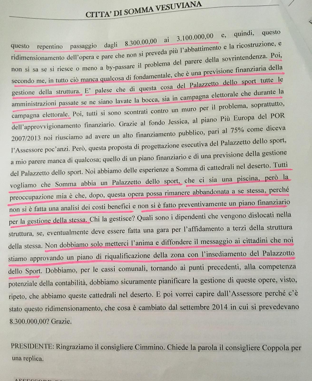 Noi di “Siamo Sommesi”, abbiamo sempre agito in piena coerenza e concretezza. A chi sa solo offendere, come Giuseppe Auriemma, ex segretario PD che, sul social Facebook in un post, ci ha etichettato come ipocriti, vorremmo ricordare dichiarazioni molto importanti e veritiere che in passato sono state fatte da altri. Nel 2015, durante il consiglio Comunale, infatti, il consigliere Giuseppe Cimmino del PD, dichiara a più riprese di essere molto perplesso e di non essere convinto della buona riuscita del progetto: “La storia di questo Palazzetto dello Sport risale al lontano 2004 (…) prevedeva un progetto di 6 milioni e mezzo di euro. (…) annullato dalla Sovrintendenza per i beni architettonici e per il patrimonio artistico, perché (…)il fabbricato (…) manca del necessario parere della Sovrintendenza. (…) In tutto ciò manca qualcosa di fondamentale, che è la previsione finanziaria della gestione della struttura”. Dice e poi aggiunge: “Tutti vogliamo che Somma abbia un Palezzetto dello Sport, che ci sia una piscina, però la preoccupazione mia è che, dopo, questa opera possa rimanere abbandonata a se stessa, perché non si è fatta una analisi dei costi benefici e non si è fatto preventivamente un piano finanziario per la gestione della stessa.” Ma ci piace ancor di più riportare una dichiarazione dello stesso Cimmino, che ben mette in luce la situazione: “E’ palese che di questa cosa del Palazzetto dello Sport tutte le amministrazioni passate se ne siano lavate la bocca (…) Non dobbiamo solo metterci l’anima e diffondere il messaggio ai cittadini che noi stiamo approvando un piano di riqualificazione della zona con l’insediamento del Palazzetto dello sport (…) dobbiamo pianificare la gestione di queste opere”. L’idea, dunque, era quella di agire prima di tutto per il bene dei cittadini, amministrando il denaro pubblico al meglio, senza riportare inutili spese di “CATTEDRALI NEL DESERTO”.