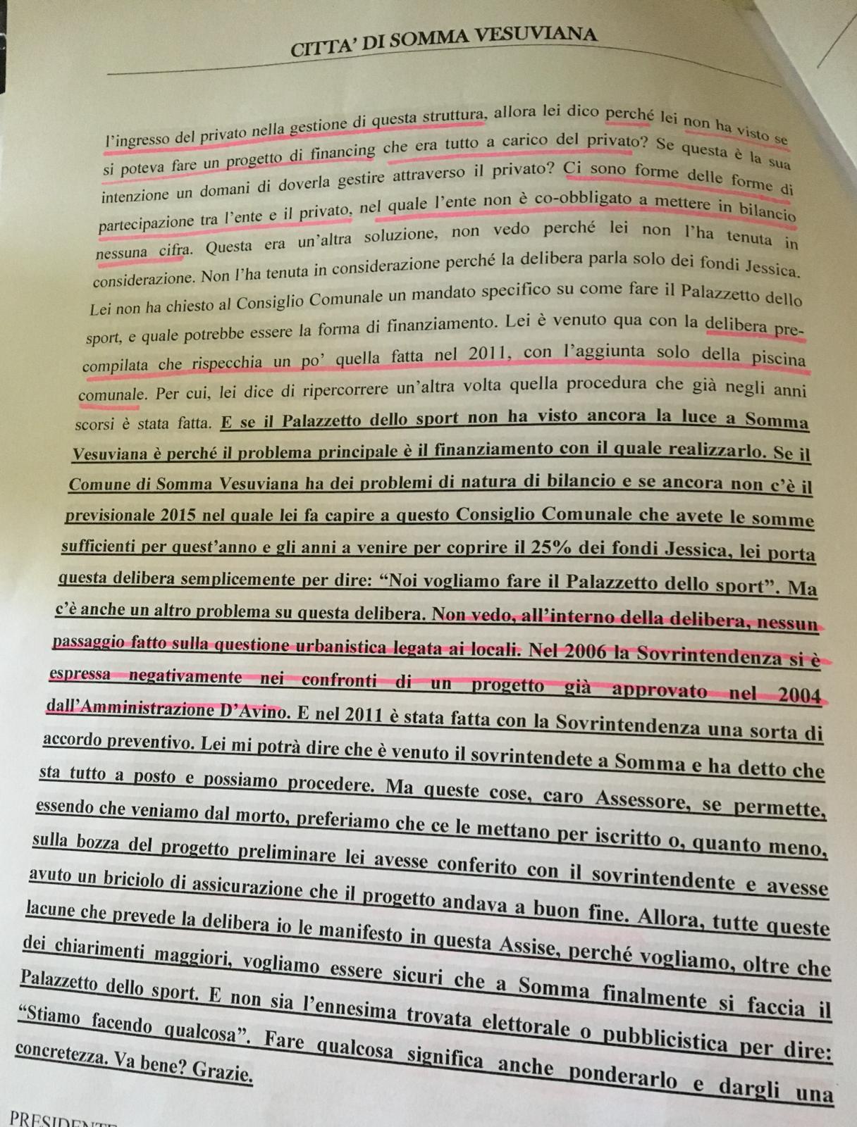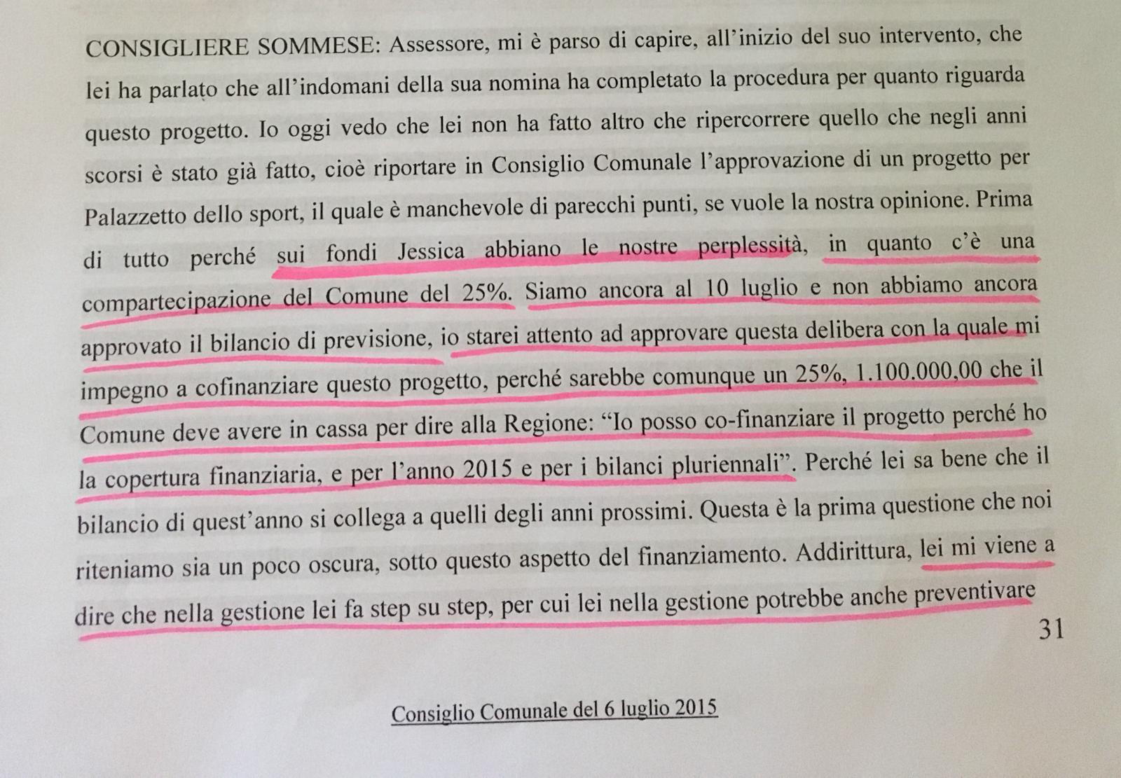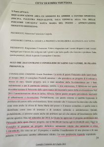 Sempre coerenti e concreti nell’esporre le nostre idee, nella stessa sede citata sopra, il nostro attuale Presidente del Consiglio, Giuseppe Sommese, mostrava giustamente le forti perplessità all’Assise, in merito alle lacune che prevedeva la delibera presentata, soprattutto in termini di finanziamento e sulla mancanza dell’aspetto della legittimità paesaggistica: “(…) sui fondi Jessica abbiamo le nostre perplessità, in quanto c’è una compartecipazione del Comune del 25% (…) starei attento ad approvare questa delibera con la quale mi impegno a confinanziare questo progetto (…) 1.100.000,00 che il Comune deve avere in cassa”. Rivolgendosi poi all’allora Assessore Coppola “Lei mi viene a dire che nella gestione fa step su step, per cui nella gestione potrebbe anche preventivare l’ingresso di un privato (…) perché non ha visto se si poteva fare un progetto di financing che era tutto a carico del privato? ” Altro aspetto fondamentale posto in essere grazie al prezioso intervento del Presidente Sommese, fu il fatto che la delibera presentata in Consiglio nel 2015 rispecchiava quella del 2011 “con l’aggiunta solo della piscina comunale”, progetto che come abbiamo visto in precedenza fu annullato perché privo del parere della Sovrintendenza.