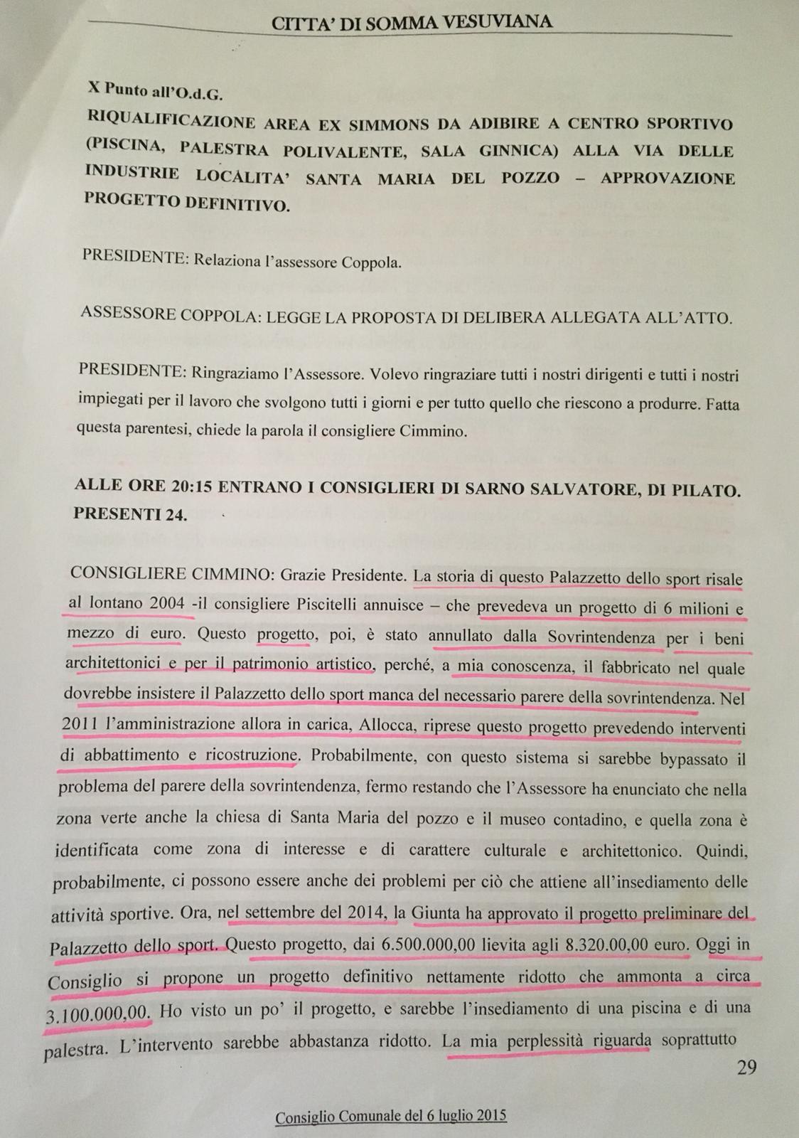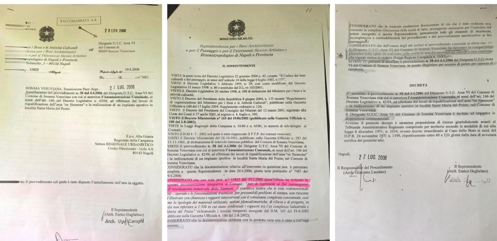 Nel 2006 l’amministrazione D’Avino riceve parere contrario da parte dei “Beni Architettonici e per il Paesaggio e per il Patrimonio Storico Artistico e Etnoantropologico di Napoli e Provincia”. Nel documento datato luglio 2006 si legge “Annullamento del provvedimento n.58 del 4.4.2006 del Dirigente U.T.C. Area VI del Comune di Somma Vesuviana con cui l’Amministrazione Comunale ai sensi dell’art 146 del Decreto Legislativo n. 42/04, ad effettuare dei lavori di riqualificazione dell’area “ex Simmons” e la realizzazione di un impianto sportivo in località Santa Maria del Pozzo”. Andiamo alle motivazioni dell’annullamento e leggiamo ancora: “CONSIDERATO che con nota prot. N° 11823 del 19.5.2006 quest’Ufficio ha richiesto la seguente documentazione integrativa al Comune: “Atti di legittimità ai fini paesaggistici dell’insediamento industriale della Simmons”(…)”la documentazione richiesta con la predetta nota non è stata a tutt’oggi trasmessa.”
