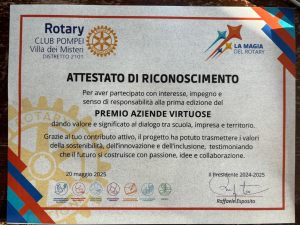 Durante la manifestazione è stata premiata anche l’azienda Maxtris Confetti di Somma Vesuviana, riconosciuta per il suo impegno e la qualità nel proprio settore. L’iniziativa ha rappresentato un momento di confronto e valorizzazione delle cosiddette “best practices”, in un’ottica di sensibilizzazione delle nuove generazioni.