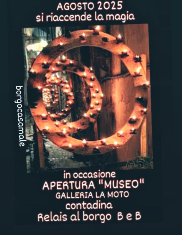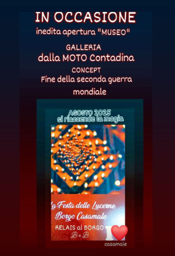 Nel cuore del Borgo Casamale, apre un luogo che racconta l’anima semplice e laboriosa del dopoguerra italiano. In occasione dell’evento che si terrà ad agosto 2025 in attesa della Festa delle Lucerne 2026, sarà inaugurata ufficialmente la Galleria “La moto contadina”, un museo allestito nella suggestiva cantina antica del B&B Relais al Borgo, gestito da Giuseppe Molaro.