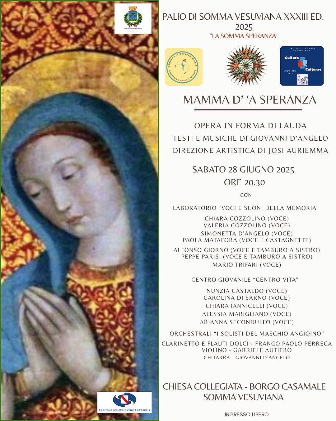 Sabato 28 giugno 2025 alle ore 20.30 nella chiesa Collegiata al Borgo medioevale Casamale, in occasione della presentazione del nuovo Brand Culturale del Palio di Somma Vesuviana e degli eventi associatiper la XXXIII Edizione (12-13-14 settembre p.v.) della manifestazione, sarà eseguita l’Opera scritta da Giovanni D’Angelo e Diretta da Josi Auriemma: MAMMA D’ ‘A SPERANZA.