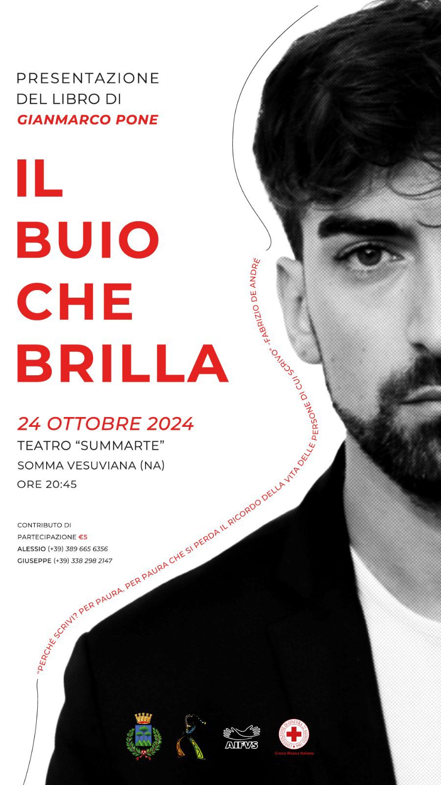 Giovedì 24 ottobre alle ore 20.45, presso il teatro Summarte di Somma Vesuviana, andrà in scena lo spettacolo “Il Buio che Brilla” organizzato dallo scrittore napoletano Gianmarco Pone, in collaborazione con Alessio Evangelista e Giuseppe Esposito, in una serata in cui l’autore presenterà il proprio libro dall’omonimo titolo.