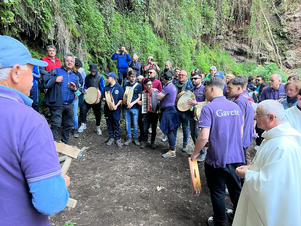 “Oggi abbiamo salutato il Primo Maggio con la Festa della Montagna che questa volta ha fatto tappa alla sorgente Le Gavete con la paranza tradizionale di canto popolare, la ceebrazione della Santa Messa e la consegna della perteca alla Madonna, poi l’arrivo delle paranze al Santuario con la benedizione iniziata da poco. Nell’eruzione del 1631 la lava risparmiò la testa lignea della Madonna di Castello, nonostante la distruzione della chiesa che la ospitava.