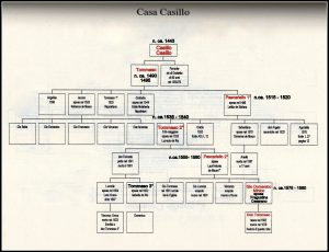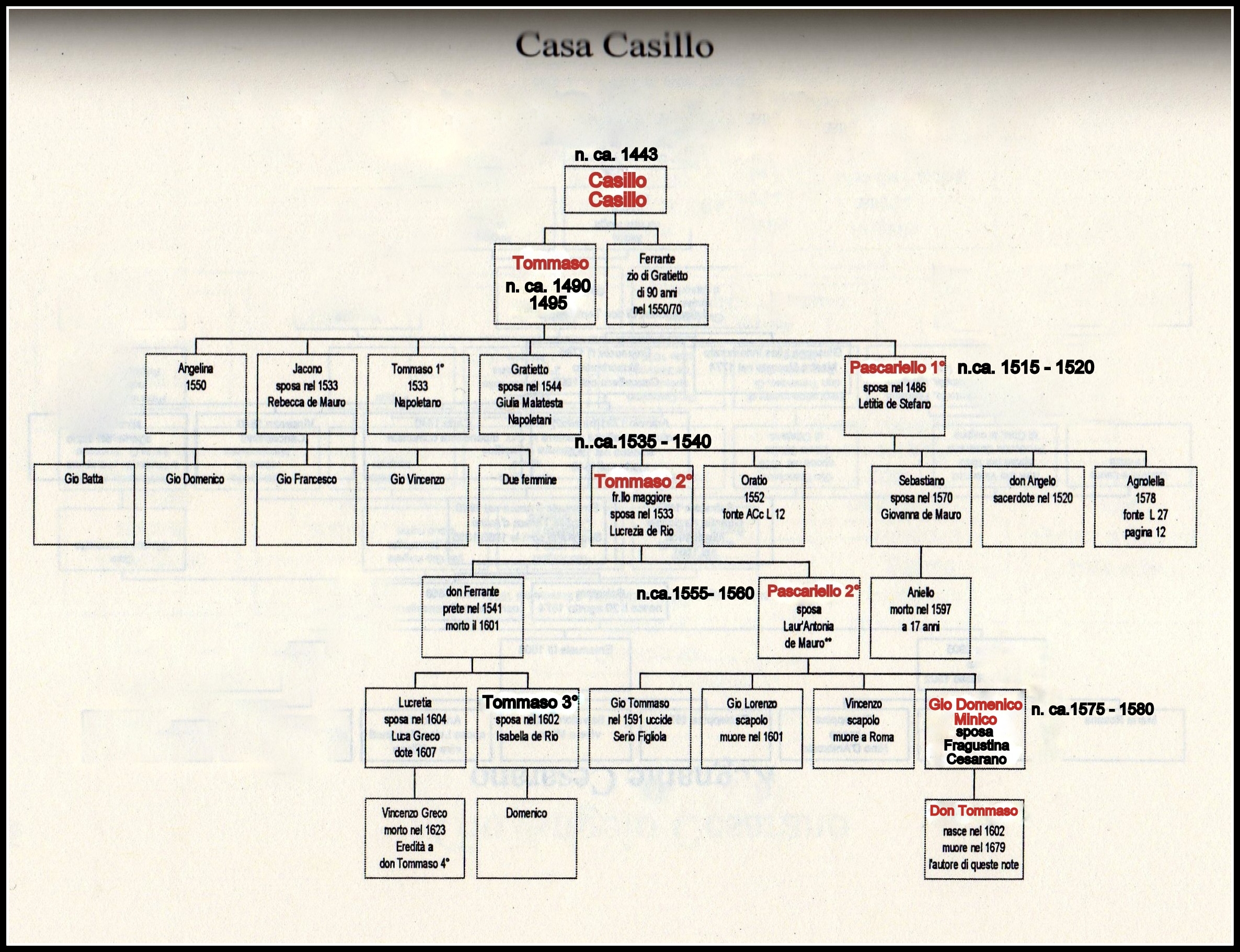 “Il parroco d. Tommaso Casillo, nella sua opera relativa alla sua famiglia, traccia un filo genealogico del suo ramo paterno, partendo da sé medesimo [Casillo T., Libro di memoria di me D. Thomase Casillo, Somma Vesuviana (Na), 1631, Manoscritto]. A riguardo, il presbitero nacque a Somma il 24 marzo del 1602 dal sommese Giovan Domenico Casillo, detto Minico e da Fragustina Cesarano della vicina città di Ottaviano. Il matrimonio fu celebrato il 3 agosto del 1600, per cui, considerando i classici 20-25 anni di differenza perché, all’epoca, ci si sposava molto giovani di solito, suo padre Minico doveva essere nato intorno al 1575-1580 circa (vedi albero genealogico).