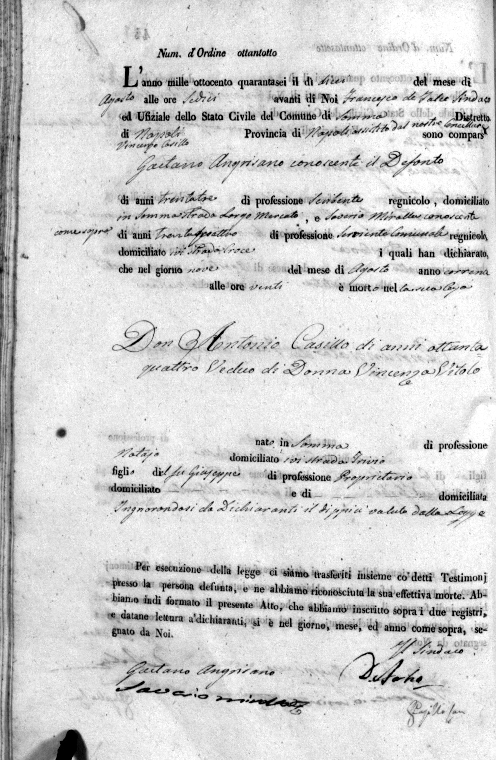Nel 1887 il barone Augusto Vitolo Firrao nella sua opera dal titolo La Città di Somma Vesuviana illustrata nelle sue Famiglie Nobili scriveva, riferendosi ai Casillo, alcune notizie di quest’ antico e nobile casato, estintosi nei Vitolo, riannodandosi principalmente all’Insigne Collegiata del borgo murato e all’ antico ufficio del mastromercato di Somma. A tal riguardo, leggendo attentamente, il barone Augusto asserisce che Mons. Tommaso Casillo – utroque iure, protonotario apostolico e parroco della Chiesa di San Pietro Apostolo – nella seconda metà del XVII secolo fece costruire a sue spese il ricco ed artistico soffitto della predetta Collegiata. Nel 1679, anno della sua morte, col suo testamento istituì erede universale la Collegiata medesima, disponendo che le rendite del patrimonio di lui servissero per la buona manutenzione della struttura, in cui volle essere sepolto. Giace, infatti, nella prima cappella a sinistra entrando. E fin qui ci siamo. La cosa più eclatante, però, esaltata dal Vitolo, non estraneo a queste manie araldiche, e che i Casillo usarono per arme in campo azzurro un grifo rampante d’oro, accompagnato nel capo da un lambello di rosso a tre pendenti. Questo stemma si vede tuttora scolpito in marmo su le pile delle acquasantiere della Collegiata ed è ornato di un cappello di protonotario apostolico, perché fatto a spese di Don Tommaso. Il barone Vitolo Firrao, oltrettutto, non omette di avvertire che quell’ arme dei Casillo di Somma era identica all’epoca, per le pezze e colori, a quella dei Caselli di Cosenza siccome vedesi incisa e descritta nell’opera del Castiglione – Morelli, intitolata De Patricia Cosentina Nobilitate. Stante ciò – continua Vitolo – potrebbe credersi che tra queste due famiglie vi sia comunanza di origine e che l’accidentale differenza del cognome sia dipesa, come tante altre, dalla varietà dei dialetti. Per districarci in questa ragnatela storica, mi sono recato a Napoli ad intervistare l’ Ill.mo Avv. e araldista Nicola Pesacane, il quale – in qualità di Master Universitario di II Livello in Araldica, di esperto universitario in Araldica, di ex professore universitario a contratto di Araldica, di Perito in Araldica iscritto ai Ruoli delle Camere di Commercio di Roma e di Bologna e di Docente di Araldica presso la Scuola di Araldica, Genealogia e Scienze Documentarie della Storia dell’Istituto Araldico Genealogico – IAGI di Bologna – ha voluto fornirci alcuni chiarimenti in relazione alle notizie riportate dal barone Vitolo Firrao. Certamente da una ricognizione fatta nel Catasto Onciario del 1744 non appare nessun nobile Casillo, ma tanti bracciali, mastri falegnami, un maniscalco, un sartore, un solapianiello, un mastro barbiere, un clerico, un sacerdote e tre privilegiati napoletani. Lo stesso d. Antonio Casillo, notaio, morto nel 1846, era figlio del proprietario d. Giuseppe, ultimo mastromercato di Somma. Era l’unico caso di un’ antica nobiltà personale di carica, che purtroppo nel tempo non si consolidò in nobiltà generosa [ Degli Uberti P. F. – Pinotti M.L., Storia del diritto nobiliare italiano, Vol.1, IAGI] in quanto d. Antonio non ebbe figli, ma lasciò solamente numerose proprietà al nipote d. Luigi Vitolo, avendo sposato una zia.