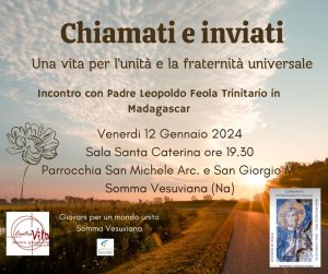 Venerdì 12 gennaio 2024, i festeggiamenti continueranno alle ore 19:30 con un incontro nella sala Santa Caterina sul tema Chiamati e inviati – Una vita per l’ unità e la fraternità universale. L’ evento, alla presenza di padre Leopoldo, sarà curato dai Giovani per un mondo unito con il Centro Vita e dalla Comunità interparrocchiale San Giorgio Martire – San Michele Arcangelo.