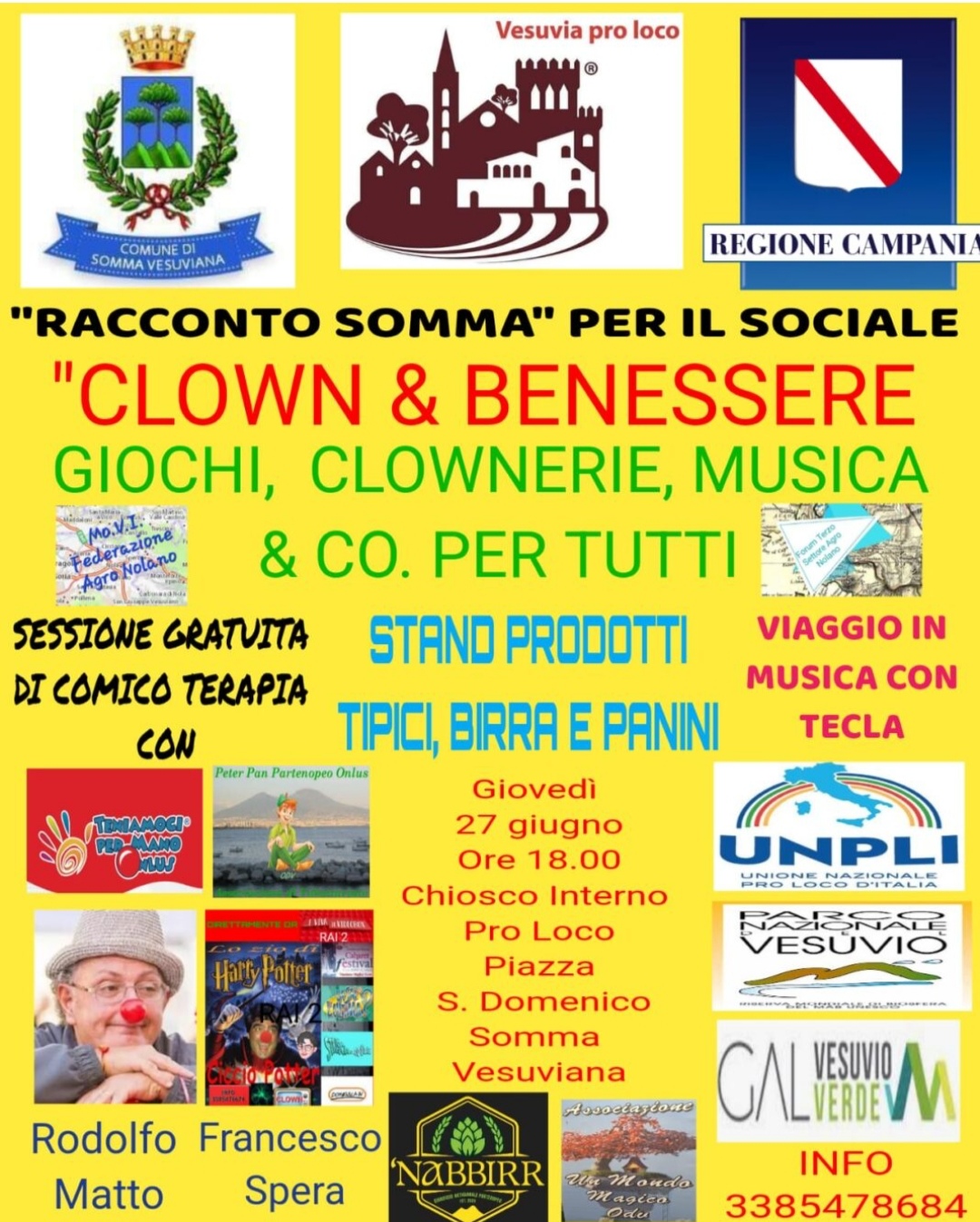 Il 27 giugno alle ore 18:30 nel convento e chiostro di San Domenico, adiacente alla piazzetta G. Marconi in Somma Vesuviana, si terrà un evento organizzato dalla Pro loco Vesuvia dal titolo “Racconto Somma nel sociale”. Questo progetto mira a promuovere il territorio attraverso la cultura, le tradizioni e i prodotti tipici – spiega il presidente della Pro loco Lello D’Avino. Lo scopo è di divulgare le tecniche della clown terapia e far avvicinare i giovani al sociale, per portare un sorriso nei luoghi di dolore e di speranza. Alle 18:45, inoltre, sarà inaugurata una sezione del “Fondo Librario” dell’Archivio storico cittadino, collocata nella sede della Vesuvia Pro loco. La piccola biblioteca sarà intitolata al compianto professor Lorenzo Ferrara, educatore di tante generazioni di sommesi, con la scoperta di una targa in sua memoria. Saranno presenti: Alessandro Masulli, direttore dell’Archivio storico di Somma Vesuviana; la moglie e il figlio del professor Lorenzo Ferrara. L’ evento proseguirà con la presentazione del CD musicale del Maestro Girolamo De Simone dal titolo “Liturgie”. Sarà allestita, anche, una mostra fotografica di Genny Maggiore che racconterà attraverso le immagini il territorio con le sue bellezze artistiche e monumentali.