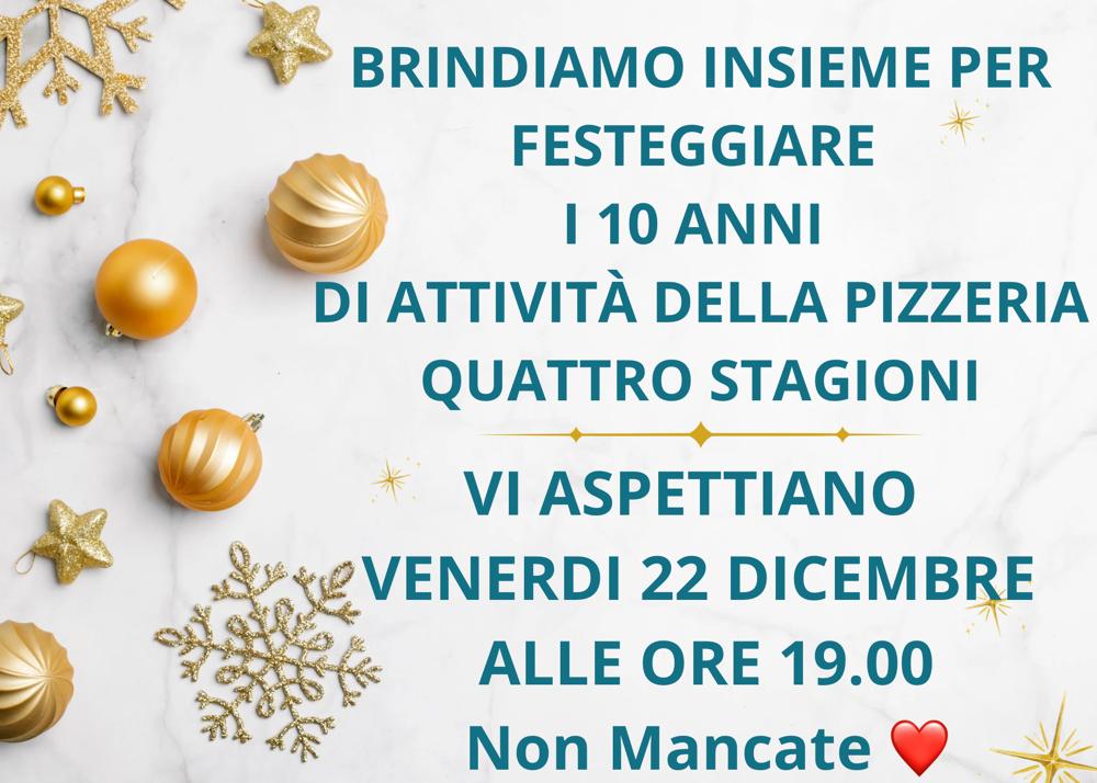 Venerdì 22 dicembre grande festa per la Pizzeria “4 Stagioni” che compie ben dieci anni di attività. Si tratta di un traguardo importante per il titolare Gaetano Nocerino e per sua moglie Maria, i quali, per festeggiare e condividere con tutti questo momento di grande emozione, hanno deciso di organizzare, presso il loro locale di Via Macedonia, una serata di degustazione.