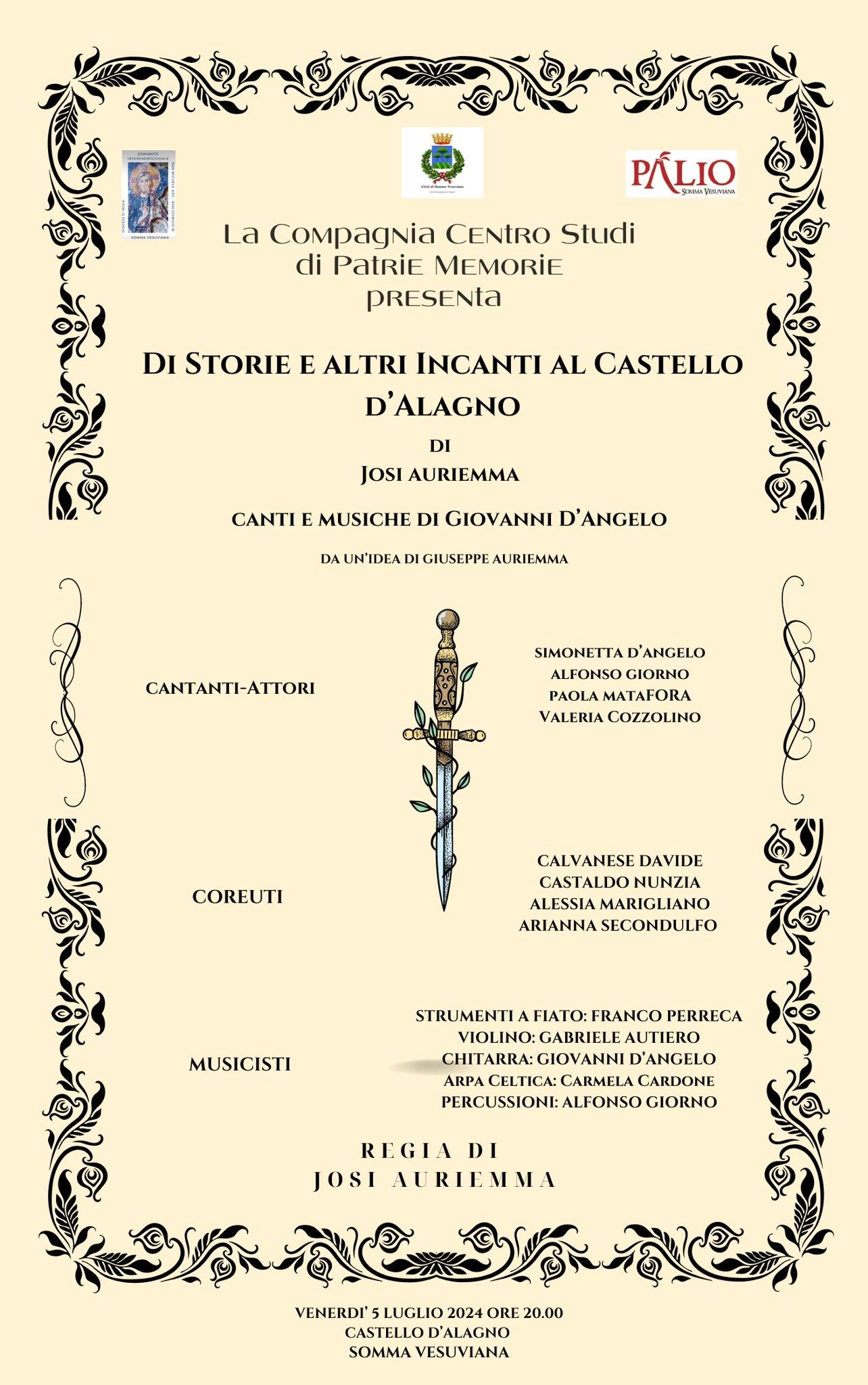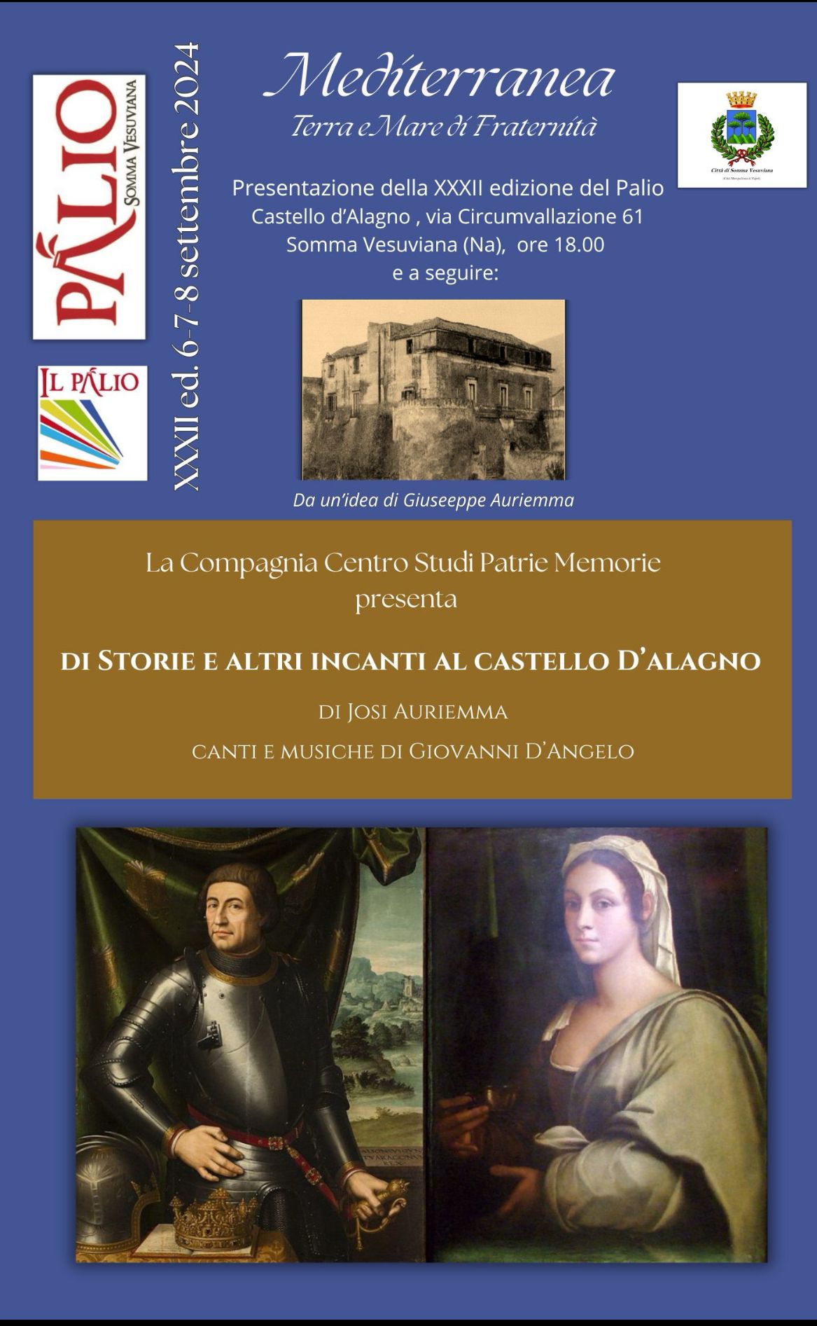 “Di Storie e altri Incanti al Castello d’Alagno” è uno spettacolo itinerante di Josi Auriemma, da un’idea di Giuseppe Auriemma, ispirato a personaggi, fatti e fattarelli riferiti al periodo aragonese a Napoli. La drammatizzazione si avvale del talento poliedrico dei cantanti-attori Simonetta D’Angelo, Alfonso Giorno e Paola Matafora, Valeria Cozzolino, affiancati da giovani collaboratori del Palio: Davide Calvanese, Nunzia Castaldo, Alessia Marigliano e Arianna Secondulfo, alla loro prima esperienza teatrale, desiderosi di avvicinarsi alle “Patrie Memorie Vesuviane”.I canti e le musiche sono di Giovanni D’Angelo, eseguite dai musicisti: Francesco Perreca (strumenti a fiato), Gabriele Autiero (violino), Alfonso Giorno (percussioni), Carmela Cardone, Arpa Celtica e dallo stesso Giovanni D’Angelo alla chitarra. Le tematiche dei brani musicali individuate dall’autrice e regista Josi Auriemma, riguardano aspetti salienti del dipanarsi della leggendaria storia d’amore tra Alfonso d’Aragona il Magnanimo e Lucrezia d’Alagno: la ritualità legata al vaticinio della Notte di San Giovanni e alla danza propiziatoria del Giorno di San Giovanni; un Magnificat dedicato alla regalità di Alfonso; la moneta (strenna dalla quale tutto parte e che, tutto sommato, ha fatto la fortuna di Somma Vesuviana); un inno alla bellezza di Lucrezia; un canto malinconico sul loro amore inviso e travagliato. Alla fine dell’evento, gli artisti saluteranno il pubblico con un “Convivio” offerto dal Comitato Palio.