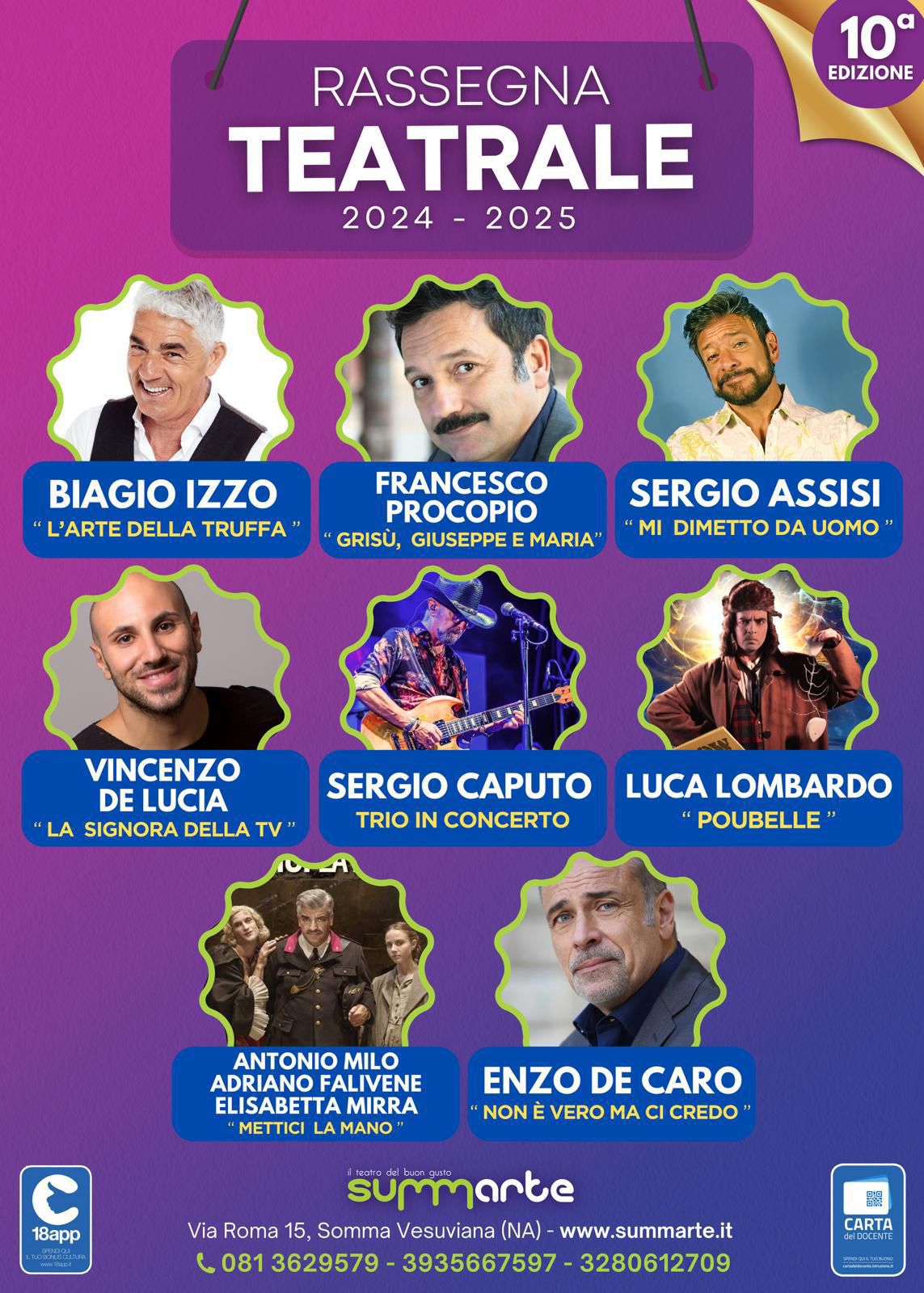 Il Teatro Summarte è pronto ad accogliere il suo affezionato pubblico per una stagione indimenticabile, ricca di risate, emozioni e riflessioni. Vi aspettiamo numerosi per celebrare insieme questo decimo anniversario e vivere serate di puro spettacolo!