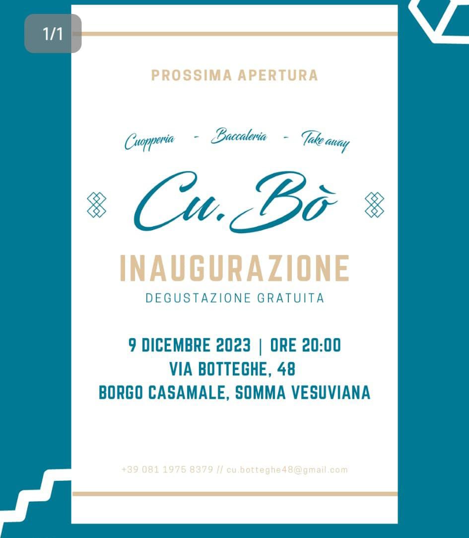 Nello scenario suggestivo e ricco di storia del Borgo Casamale di Somma Vesuviana, in via Botteghe 48, sta per essere avviata una nuova attività commerciale. Infatti, sabato 9 dicembre, a partire dalle ore 20:00, si svolgerà l’inaugurazione di “CuBò”, una nuova baccalaria, cuopperia e take away. Nella serata di apertura del nuovo store sarà possibile degustare gratuitamente le prelibatezze del mare e i gustosi piatti che faranno parte della vasta offerta gastronomica del locale.