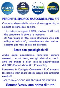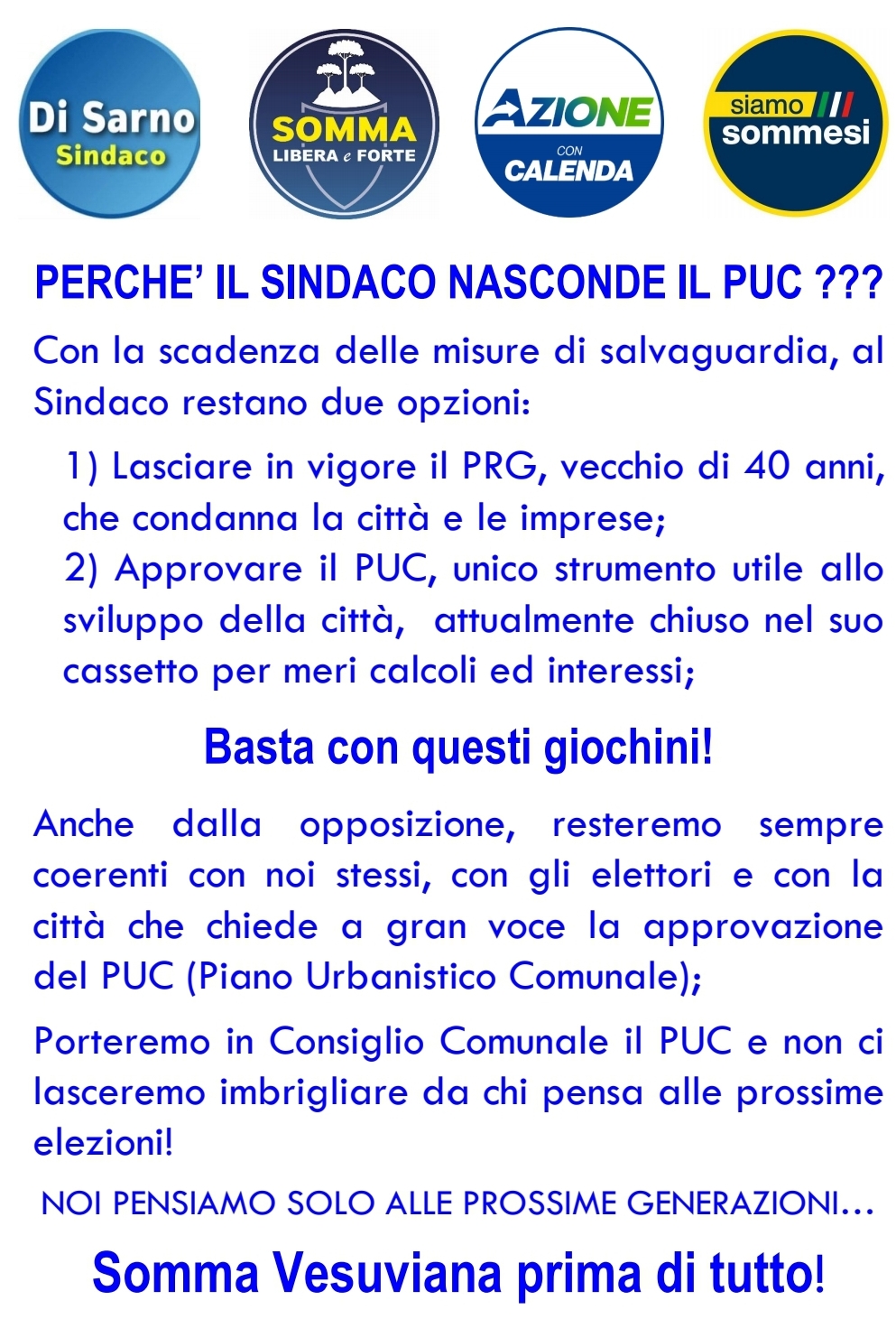 “Insieme ai gruppi lista Di Sarno, Somma libera e forte e Azione, anche Siamo Sommesi chiede a gran voce al sindaco e a tutta l’amministrazione comunale di portare urgentemente in consiglio comunale l’approvazione del Puc”. A dichiararlo è Giuseppe Nocerino, consigliere comunale del gruppo Siamo Sommesi, che ha sottoscritto un manifesto col quale, insieme ad altri consiglieri comunali, chiede all’esecutivo l’approvazione del Puc a Somma Vesuviana.