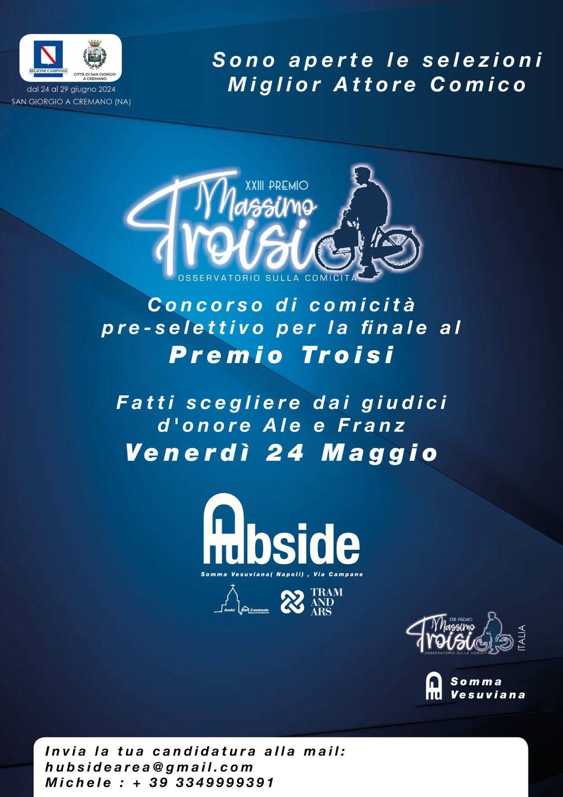 Il Premio Massimo Troisi, concorso nazionale dedicato allo spettacolo prevalentemente dedicato ad attori comici istituito nel 1996 arriva al Casamale. La collaborazione tra il comune di San Giorgio a Cremano e l’Hubside (spazio libero delle Arti curato dalle associazioni Amici del Casamale e Tramandars) ha permesso la realizzazione di un concorso comico pre-selettivo per le fasi finali del premio Troisi, quest’anno con la direzione artistica di Ale e Franz. La partecipazione è aperta a tutti gli aspiranti comici e cabarettisti della regione Campania, già numerose le adesioni. Il concorso di miglior comico del Casamale si svolgerà nello spazio Hubside, ipogeo della Chiesa Collegiata sito in via Campane il 24 Maggio e permetterà al vincitore di entrare direttamente alla semifinale del premio Troisi di fine Giugno. I partecipanti verranno valutati da una giuria popolare e una giuria tecnica formata da: Luca Bruno, vincitore uscente del premio Troisi, l’attore ed autore teatrale Rosario Minervini e la bravissima Maria Bolignano che ricoprirà il ruolo di presidentessa di giuria. Ingresso gratuita, gradita e fondamentale la partecipazione!
