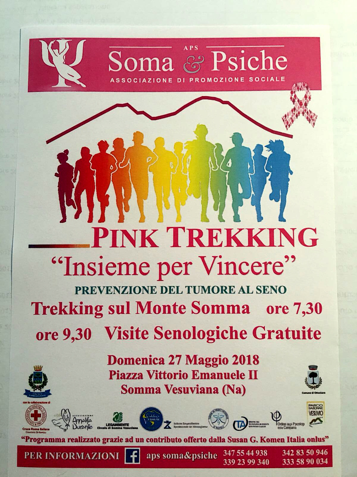 Il raduno per Pink Trekking è previsto alle 7, 30 di domani in piazza, con distribuzione di kit offerti da Supermercati Gennarì e Mocerino Frutta Secca. Si partirà poi per la passeggiata, due ore circa, sul Monte Somma, in collaborazione con l’Associazione “Outdoor Vesuvio”; dalle ore 9.30, sempre in Piazza Vittorio Emanuele III, visite senologiche gratuite in collaborazione con la Croce Rossa Italiana.