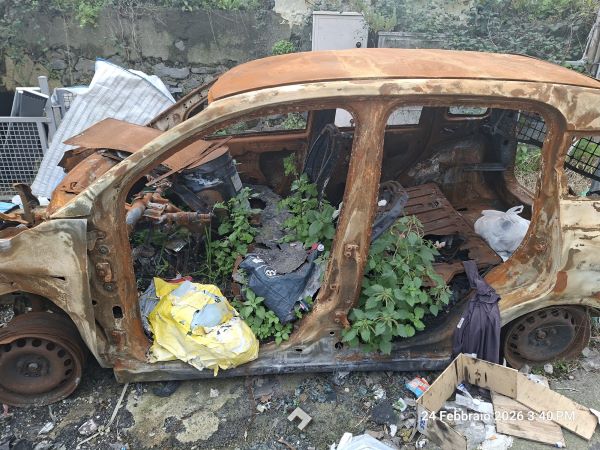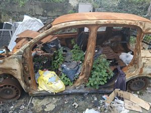 Col passare dei mesi, la situazione è ulteriormente peggiorata. La macchina, ormai ridotta a uno scheletro carbonizzato, è diventata un ricettacolo di rifiuti. Sacchi dell’immondizia e materiali di vario genere vengono abbandonati dentro e attorno al veicolo.