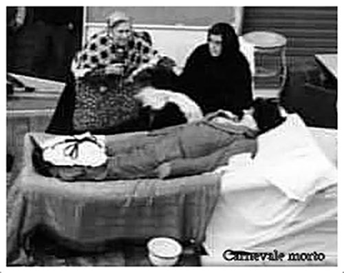 A Somma Vesuviana il carnevale si festeggiava, come di consuetudine, il martedì grasso. Di mattina i ragazzini sfrenavano la loro festosità davanti alle scuole e per le strade con buste di farina e uova marce. La piazza centrale, quella del mercato di una volta, era il luogo di ritrovo per eccellenza. Ogni ragazza che s’avventurava nei paraggi era assalita e infarinata. Per le vie, intanto, sfilavano in bella mostra graziose mascherine. I bambini, in particolare, erano un po’ più goffi – afferma Angelo Di Mauro – per colpa dei maglioni di lana, che, indossati sotto i leggeri vestiti di raso, li proteggevano ancora dall’inverno rigido. All’ora di pranzo lo schiamazzo e il rincorrersi si attenuava. Il basolato stradale rimaneva per giorni rigato di bianco: era la farina andata vuoto. All’imbrunire della giornata lo scenario cambiava con la presenza, stavolta, degli adulti. Normalmente si mangiava di sera: ancora oggi qualcuno rispetta questa regola. Le donne e i bambini rimanevano a casa, come anche gli anziani. Raramente le porte venivano aperte in questa serata di baldoria, dove allegre masnade di persone la facevano da padrone. Non siamo più in presenza, questa volta, delle belle mascherine, ma da volti strafatti con trucchi grossolani, vivaci e talvolta orrendi. Prevaleva, infatti, il colore nero. I vestiti erano i più vecchi e larghi possibili e presentavano segni di una povertà contadina, di farina e di carbone. Negli sfottò, primeggiava non solo l’aggressività verbale con urla e schiamazzi, ma anche quella fisica. A riguardo le mazze di legno, nascoste sotto i vestiti, non servivano solo per l’offesa, ma anche per la difesa. Erano le stesse mazze o bastoni che i confratelli incappucciati sommesi delle confraternite, durante le loro processioni penitenziali, portavano sotto le tuniche per punire chi passava tra le loro file, come ci attesta una rivista torinese del 1907 dal titolo Archivio per lo studio delle tradizioni popolari. Tornando al carnevale, non era raro vedere ragazze travestite da maschi: i cosiddetti effeminati. Nell’occasione si poteva incontrare per le strade un carrettino col morto, che veniva pianto a più voci dai compagni di giuoco. Esso veniva preparato nei quartieri periferici del paese e dopo una solenne abbuffata veniva portato in corteo per il centro abitato.