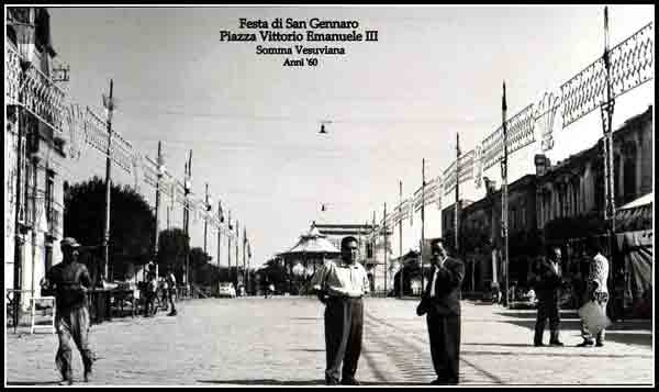 San Gennaro Martire è patrono di Somma dal 1859, ma prima ancora altri protettori si sono avvicendati nella storia millenaria della città: San Domenico (1642), San Sebastiano e la Madonna del Rosario (1649), la Madonna di Castello (1660). Con l’investitura a patrono di San Gennaro la nuova festa assorbì quella della Piedigrotta a Somma in auge nel 1899. Questa festa nacque, precisamente, la sera del 20 agosto 1899 da una modesta riunione tenuta nell’aula consiliare e promossa dal sindaco dell’epoca Avv. Paolino Angrisani per promuovere i festeggiamenti del Santo Patrono. L’idea di una Piedigrotta a Somma, che colpì tutti i consiglieri dell’epoca, sorgeva dalla necessità di voler dimostrare di essere gente nuova, fatta per cose nuove e non per le solite luminarie, mortaretti e processione. Il tentativo, però, andò a vuoto: la festa con carri, suoni, lampioni, cavalcate e canzoni durerà, infatti, solo due anni, sostituita poi dalla consuetudinaria festa.