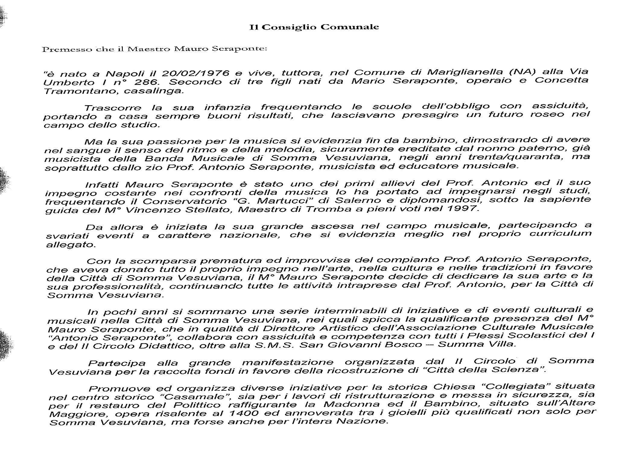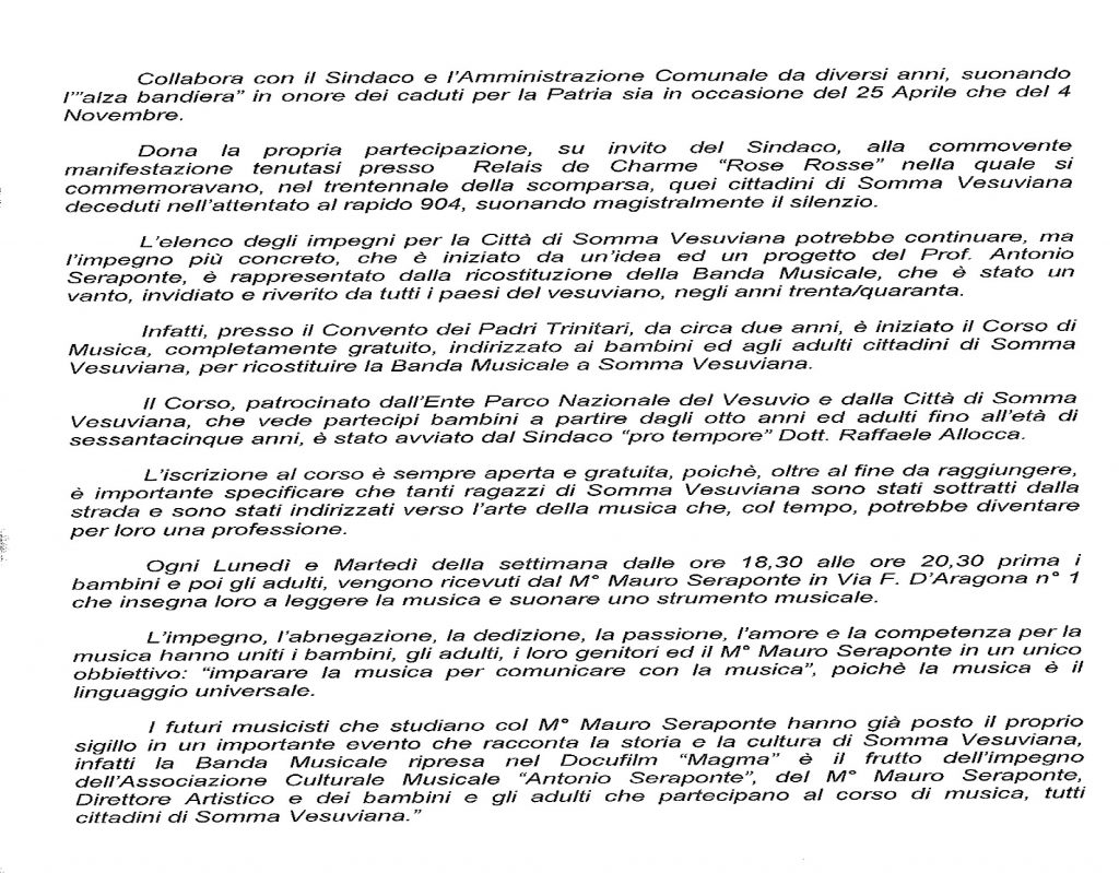 La proposta di attribuzione era già stata presentata a settembre 2014 senza risultato, reiterata poi a marzo scorso – dall’associazione musicale Antonio Seraponte e a firma del presidente Ciro Seraponte – indirizzata al presidente del consiglio comunale Giuseppe Sommese e infine portata in aula e accolta. La motivazione: «Per l’impegno sociale, la passione nel diffondere l’arte della musica a bambini, giovani e adulti del territorio di Somma Vesuviana, che sfocia anche nella lotta all’emarginazione, alla criminalità, lavorando all’integrazione e alla coesione sociale di bambini e soggetti maggiormente a rischio». La cerimonia, naturalmente con la musica quale protagonista, è poi proseguita allo chalet La Villetta.