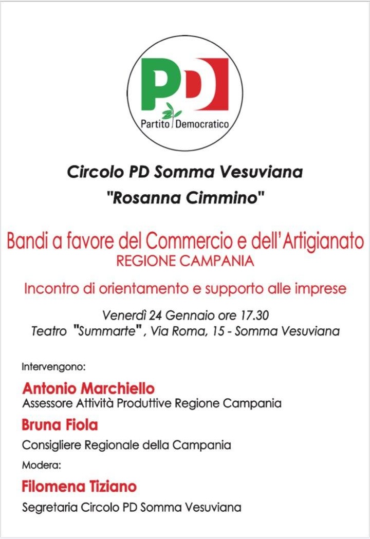 All’incontro, organizzato dal Circolo PD “Rosanna Cimmino” di Somma Vesuviana”, parteciperanno l’Assessore alle Attività Produttive della Regione Campania Antonio Marchiello e la Consigliera Regionale Bruna Fiola.