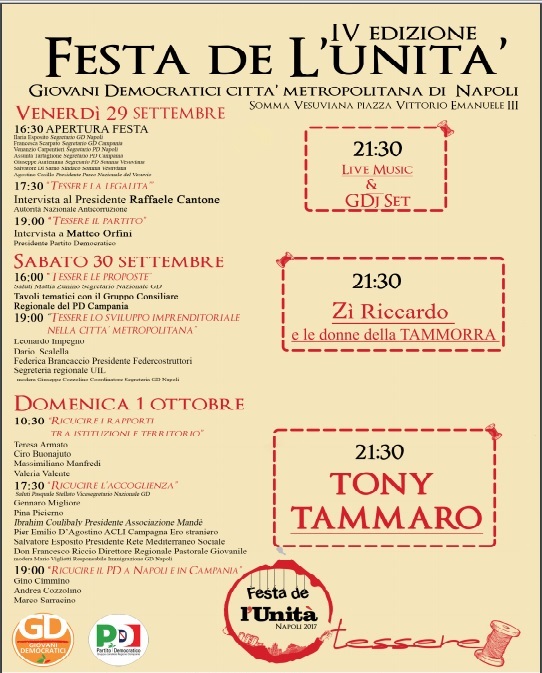 «Tessere» è il tema della quarta Festa dell’Unità organizzata dai Giovani Democratici di Napoli. «Se il vostro pensiero è andato ai rettangolini di carta, avete un problema». Parola dei GD che hanno scelto l’infinito del verbo «tessere» come filo conduttore, nel senso di «ricucire». E la location prescelta, stavolta non Napoli ma la provincia e segnatamente Somma Vesuviana, la dice lunga sulle intenzioni. Già perché a Somma, reduce da una difficile tornata amministrativa terminata con l’elezione del sindaco Salvatore Di Sarno (civiche più Udc, Verdi e Psi), il Pd non ha presentato la lista e non è dunque rappresentato in consiglio comunale. Una scelta arrivata dopo il forfait del candidato indicato, il medico Giuseppe Bianco, che denunciò poi – era maggio scorso – minacce e pressioni. Ora il Pd scenderà in piazza Vittorio Emanuele III da domani fino a domenica, con l’intenzione di «cucire a filo doppio» i rapporti con la società, le associazioni e i territori.
