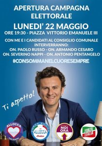 Elezioni amministrative, lunedì 22 maggio alle 19, 30, il candidato sindaco Celestino Allocca aprirà la sua campagna elettorale in piazza Vittorio Emanuele III.