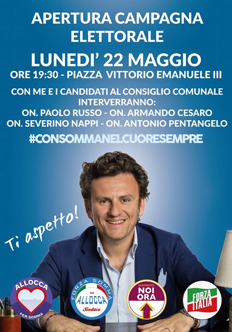 Sostenuto da quattro liste (Forza Italia, Forza Somma, Allocca per Somma e Noi Ora), Celestino Allocca avrà con sé i candidati al consiglio comunale, i consiglieri regionali Armando Cesaro e Severino Nappi, il coordinatore di Forza Italia per la provincia di Napoli, Antonio Pentangelo, e l’onorevole Paolo Russo.