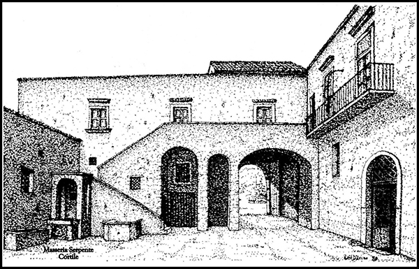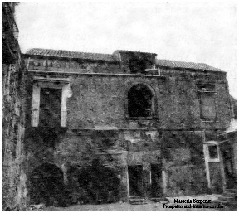 L’appellativo Serpente, invece, scaturì dal contranomme attribuito alla famiglia Romano, coloni della masseria, circa settanta anni dopo. A tal riguardo la conferma ci viene fornita sia dal Ruolo di ratizzo del vino del 1812 – 1840, dove si attesta la rendita di tale Michelangelo Romano, alias Serpente, e sia nella Matricola di Ruolo della Contribuzione Fondiaria 1812 – 1814 – 1816, dove si legge: Reviglione Giuseppe proprietario in Napoli – Coloni Romano eredi Michelangelo. Certamente quella dei Romano fu una famiglia che abitò a lungo nello stabile e si prese cura delle terre circostanti. Un ultimo discendente della famiglia Romano fu d. Antonio, bidello della scuola elementare di via Roma e padre del compianto Don Peppino Romano. Attualmente la proprietà è frazionata e la conduzione è passata nelle mani dei discendenti dei vecchi coloni. Il luogo è raggiungibile attraverso una stradina interpoderale in terra battuta, che si diparte dalla provinciale Somma – Piazzolla di Nola, proprio all’altezza del vecchio e dismesso passaggio a livello della stazione di Cancello – Torre Annunziata. Dopo aver superato l’alveo Revaglia, si incontra sulla destra il fatiscente complesso rustico. La costruzione – continua il prof. D’Avino – è impostata su una pianta a corte quasi quadrata e con la facciata, molto lineare nella sua impostazione, volta a sud e priva di qualsiasi decorazione. Un ampio portone architravato immette all’interno mediante un androne coperto da una volta a botte. Il cortile è il fulcro della costruzione e da esso prendono avvio gli accessi a tutti gli ambienti sia al piano terra che al cantinato ed al primo piano. Due scale portano al piano nobile che attualmente è diviso in due parti. Nel cortile, addossato alla scala del lato sud, si osserva il caratteristico pozzo – cisterna con il piccolo lavatoio e la vasca in piperno, mentre, inserito nel corpo murario degli ambienti del lato nord, troviamo il forno. Sulla destra del cortile vi sono gli ingressi alle vecchie stalle e depositi. Anche qui si allunga il capiente cellaio dove venivano lavorati i prodotti dei campi circostanti ed in particolare l’uva per i generosi vini, che erano poi conservati nelle profondissime cantine scavate al di sotto dell’ala ovest e nord. Oggi la folta vegetazione spontanea, composta in maggior parte da edera, ha coperto in massima parte le originarie murature a sacco con pietrame vesuviano, lasciando l’intera struttura nell’abbandono più totale.