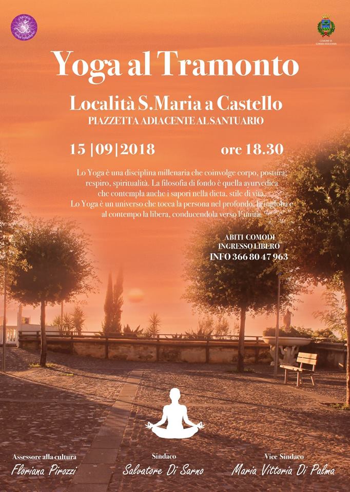 Sarà per questo che l’amministrazione comunale di Somma Vesuviana ha deciso di patrocinare un’iniziativa singolare: è prevista per domani, sabato 15 settembre, alle 18, 30. Si chiama «Yoga al tramonto» e sarà svolta con le competenze dei maestri di Yoga Yogando, come era già accaduto nei giardini del Castello d’Alagno a fine maggio scorso. Per beneficiare della iniziativa basterà recarsi in località Santa Maria a Castello poco prima delle 18, 30. Abiti comodi e ingresso libero.