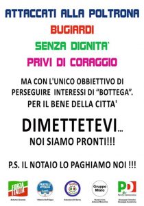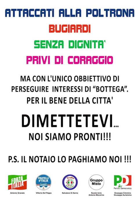E l’opposizione incalza, sui social e con manifesti: l’ultimo porta la firma di Svolta Popolare (Salvatore Di Sarno), Fratelli d’Italia (Vittorio De Filippo) Partito Democratico (Giuseppe Cimmino, Giuseppe Auriemma), Gruppo Misto (Antonio Mocerino, Nunzio Iorio) e di Antonio Granato, l’unico consigliere di Forza Italia rimasto sui banchi di minoranza. Nel manifesto i consiglieri di opposizione invitano alle dimissioni, accusano i colleghi di maggioranza di attaccamento alla poltrona e ironizzano con la chiosa: «Il notaio lo paghiamo noi».