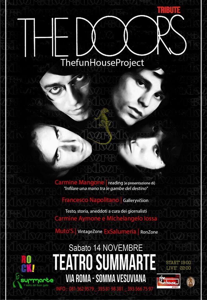 Continua il percorso di eventi per commemorare i cinquant’anni dalla formazione dei The Doors: Questa volta I Fun House Project, storica tribute band napoletana, approda al Teatro Summarte di Somma Vesuviana, grazie al supporto della Mostra Rock del Museo Pan di Napoli. L’obiettivo è quello di rendere omaggio alla band di Jim Morrison riproponendo i brani della mitica formazione di Los Angeles in modo molto fedele. Il concerto sara’ accompagnato da testi, storia, aneddoti a cura dei giornalisti Carmine Aymone e Michelangelo Iossa, curatori della Mostra Rock.