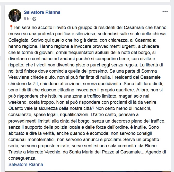 colleghi e invita a realizzare la Ztl come in tutti i borghi italiani degni di tal nome. “Chi dovrebbe intervenire non lo fa, e, come sempre, chi amministra invece di interrogarsi sulle proprie mancanze, attacca chi ci mette la faccia tacciandolo di ridicolaggine e parlando di passerelle” – scrive Sannino. Su diverse posizioni, il consigliere di opposizione Salvatore Rianna che sposa sì le richieste dei residenti, ma invoca un progetto più organico che contestualizzi il provvedimento in un piano di viabilità. E aggiunge:”Non si può rispondere che la Ztl costa troppo, la sicurezza della città non vale meno di incarichi, spese legali, consulenze e riqualificazioni”.
