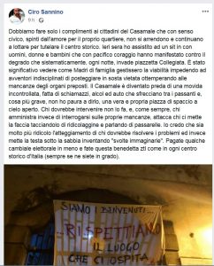 E anche il suo simbolo, l’Aurora, non compare sul manifesto che mette insieme Fi, Lista Cuore e Forza Somma. Dall’altra parte, Ciro Sannino – componente del meetup M5S, che ha poi rincarato la dose con un post nel quale stigmatizza una presunta frecciatina lanciata via social da una consigliera di maggioranza ai danni dei