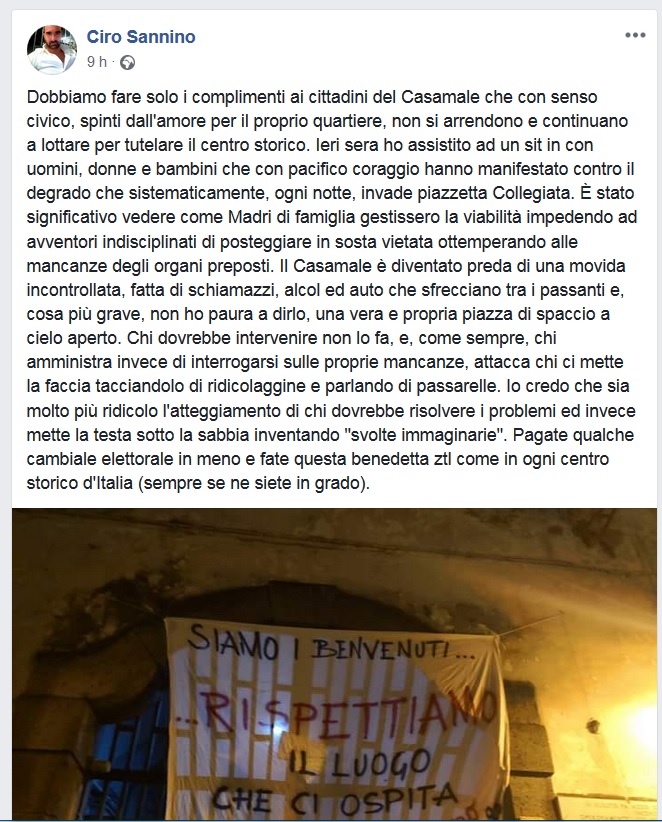 Una parte dei consiglieri di minoranza aveva già chiesto un consiglio comunale monotematico non ancora convocato, intanto però, quasi tutti erano stati invitati dai residenti ad unirsi a loro nel secondo giorno di protesta silenziosa nel quale hanno bissato il sit – in sulle scale della Collegiata. Presenti ieri sera, i consiglieri Celeste Allocca, Salvatore Granato, Umberto Parisi, Vincenzo Piscitelli. Sono loro che avevano fatto richiesta di un consiglio comunale straordinario, come del resto sottolineano nel manifesto uscito questa mattina. Manifesto in cui evidenziano quel che a loro parere – Festa delle Lucerne a parte – è un nulla di fatto per il Casamale. Quindi, da una parte c’erano loro. Mancava l’avvocato, consigliere ed ex sindaco Pasquale Piccolo.
