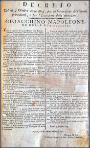 Il Decennio francese iniziò il 14 gennaio del 1806 con l’occupazione di Napoli da parte di Giuseppe Bonaparte, nominato successivamente re e rimasto in carica fino al 15 luglio del 1808, quando divenne re di Spagna. Al suo posto arrivò Gioacchino Murat, che rimase al potere fino a marzo del 1815. Sostanzialmente, durante questo periodo furono intraprese importantissime riforme nel campo politico, economico, amministrativo, finanziario, sociale e religioso, grazie alla creazione di nuovi organi istituzionali con poteri distinti e specifici. Murat, inoltre, completò, specialmente nel campo politico-amministrativo, tutte quelle iniziative che il predecessore si era preoccupato di attivare nel campo della legislazione, riguardante la disciplina e l’esecuzione delle norme generali. In particolare, i francesi volsero la propria attenzione alla questione catasto.