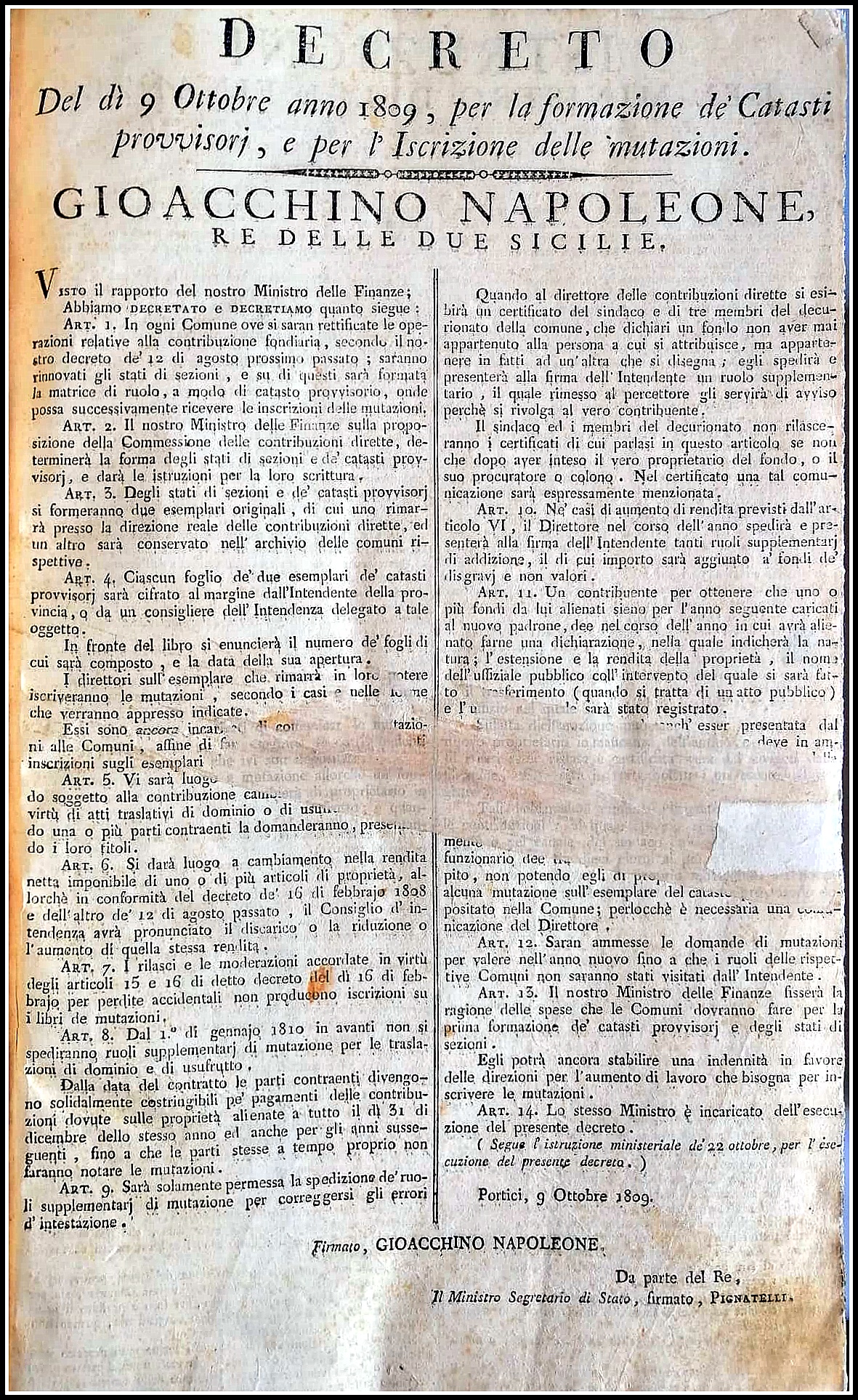Con le leggi del 4 aprile, 12 agosto e 9 ottobre del 1809, e delle istruzioni del Ministero delle Finanze del 1 e 22 ottobre dello stesso anno, ebbe inizio definitivamente la formazione del nuovo catasto francese per abolire, quindi, tutte le preesistenti forme di contribuzione diretta e sostituirle con la sola imposta fondiaria, per la prima volta applicata anche ai beni di provenienza feudale ed ecclesiastica (cit. Roberta Ventrella). Questo nuovo e più preciso strumento, denominato fino al 1870 Catasto Provvisorio Terreni, comprendeva inizialmente anche i fabbricati. L’ obiettivo era di costruire uno strumento fiscale basato su indicatori territoriali (partite) che potevano essere aggiornati ad ogni variazione e collocati sul territorio con l’ausilio, anche, di una mappatura. Il supporto cartografico, comunque, non fu mai fornito al catasto francese, rimanendo come un catasto descrittivo.